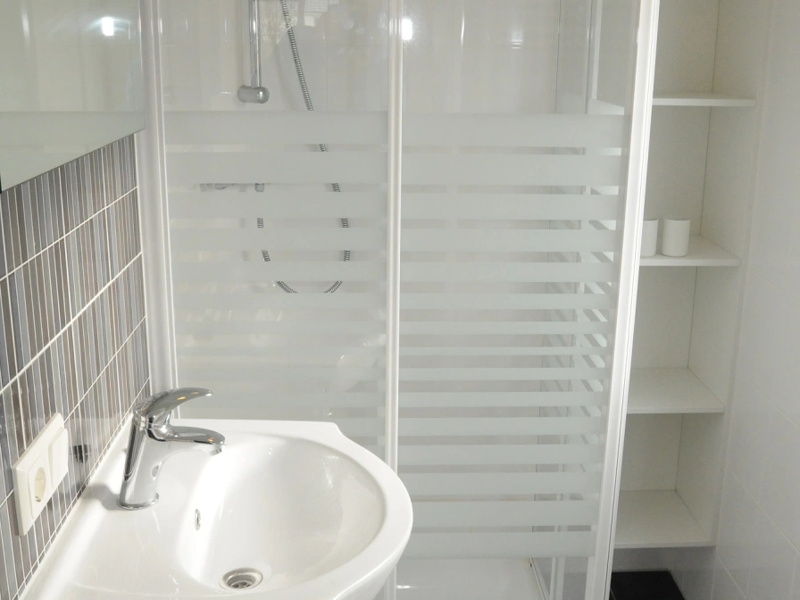 Einfach ausgestattetes Haus mit sehr engem Badezimmer.