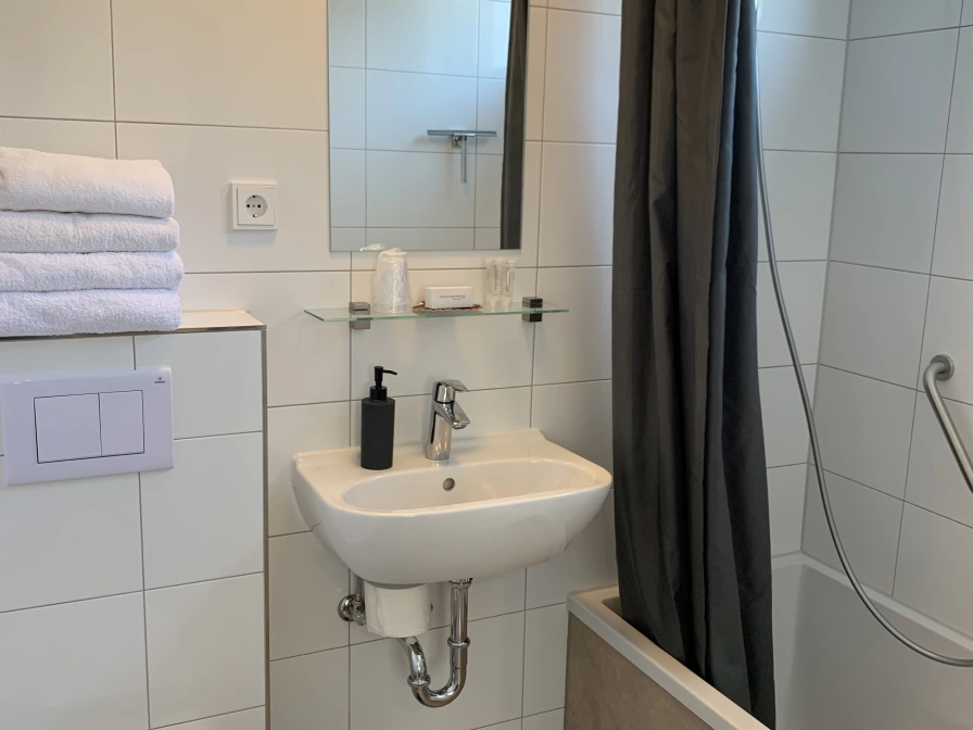 The room has a twin bed and a sitting area with smart TV. There is an electric kettle for making coffee/tea and a refrigerator. The bathroom has a hip bath, shower, sink and toilet.