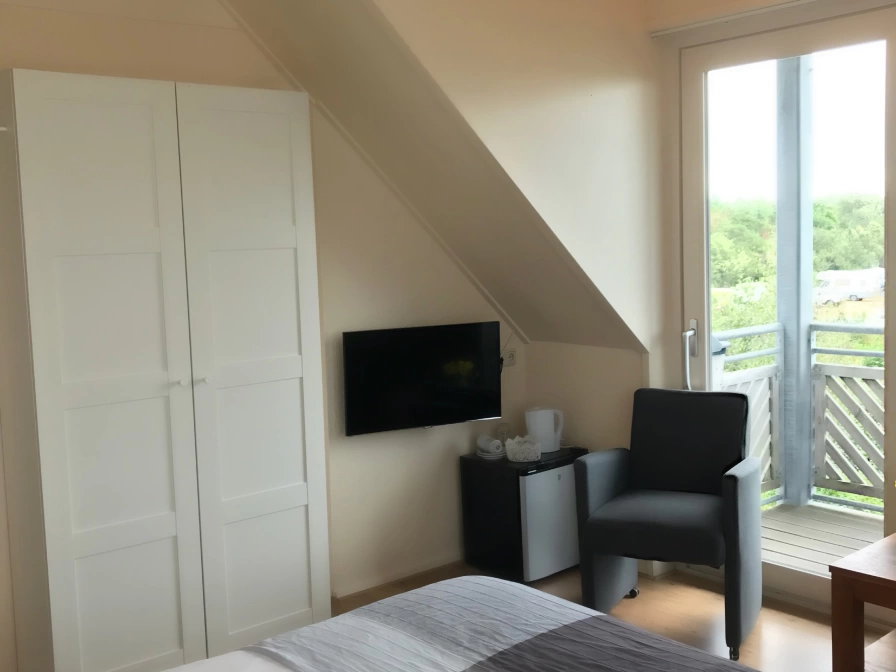 The room has a double box-spring bed and a sitting area with TV. There is a kettle for making coffee / tea and a fridge. The bathroom has a walk-in shower, sink and toilet. Garden furniture is ready for you on the balcony of the room.