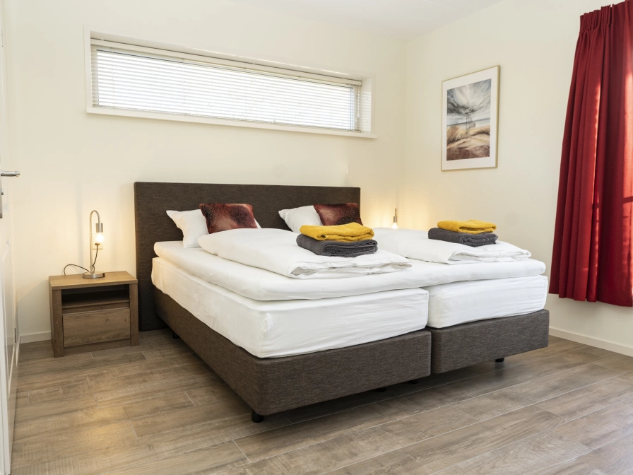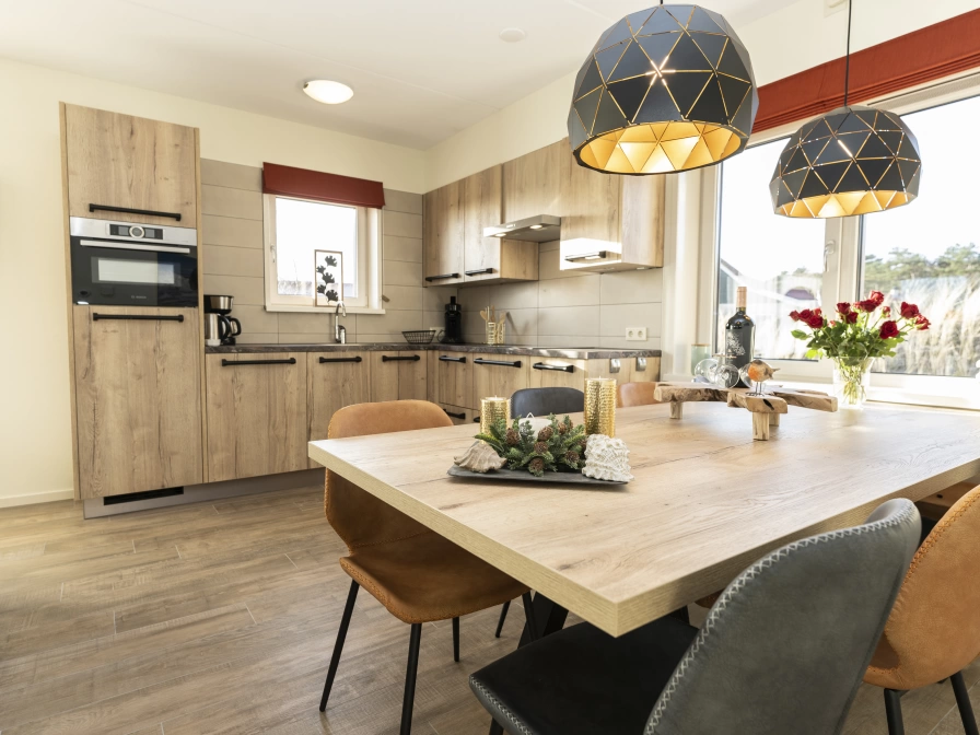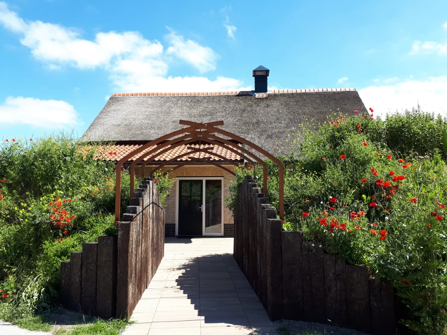Holiday villa De Conifer is a thatched villa with a luxurious, tasteful interior. Entrance in hallway with storage room, separate toilet, coat rack and mirror. Spacious living room with pellet stove, spacious living room with eight-person dining table. Sideboard with large smart TV and radio/CD player. Open kitchen with combi oven, fridge with separate freezer, dishwasher, four-burner induction hob, extensive kitchen inventory including coffee maker, Senseo, kettle, toaster, orange press and hand mixer. Master bedroom with a double box-spring bed with a mattress topper, linen closet, smart TV and blackout curtains. Bathroom (disabled friendly) adjacent to the bedroom with a very spacious shower unit with hand and rain shower, sun shower, shower chair, washbasin with mirror cabinet and a toilet with armrests. Utility room with washing machine and tumble dryer. On the first floor there is a large bedroom with two box-spring beds, a sitting area with comfortable armchairs, smart TV, chest of drawers, blackout curtains and a French balcony. The third bedroom (approx. 8.5 m2) has a luxurious box-spring bed and box-spring trundle bed, chest of drawers/chest of drawers and blackout roman blinds. The fourth bedroom (approx. 7 m2) has a luxury box spring bed and box spring trundle bed, chest of drawers/chest of drawers and blackout roman blinds. The second luxury bathroom has a bath with whirlpool function, separate shower cabin with hand and rain shower, double sink and toilet. There is also a storage room on the 1st floor with a cot, playpen and chair (bring your own linen for a cot). Next to the front door is a small shelter for storing bicycles, a scooter or outdoor toys. The spacious garden is lined with a sleeper fence, dikes and dunes. There is a south-west facing terrace with garden furniture and a patio heater/barbecue.