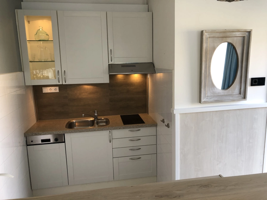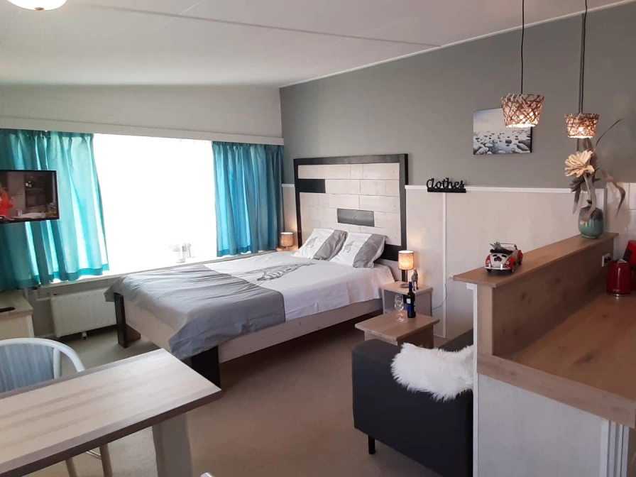 The living room / studio has a sitting area with TV, a dining area and a double bed. The open kitchen is equipped with an induction hob, fridge, combination microwave, dishwasher, kettle and Senseo appliance. There is a bedroom with one single bed and a washbasin. There is a bathroom with a shower and toilet. This holiday home has a courtyard. Garden furniture is available.