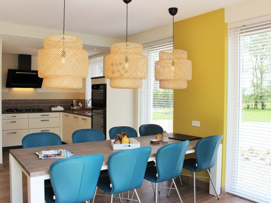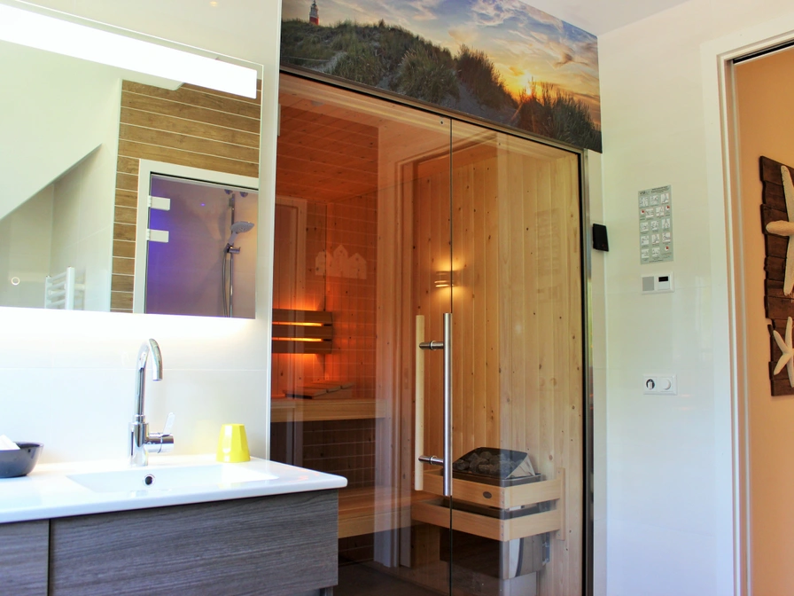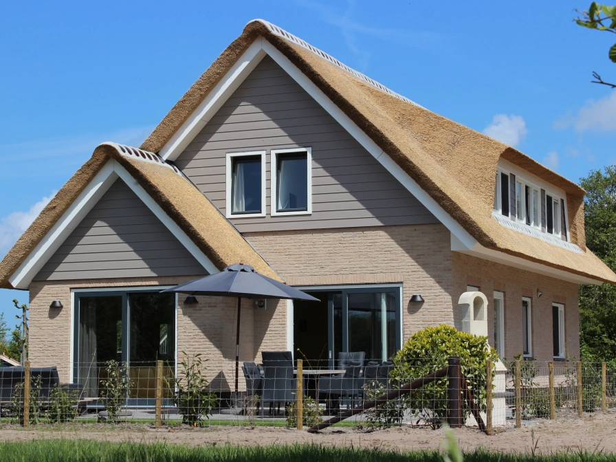 This detached, luxurious thatched wellness country house has a living room with underfloor heating and flat screen Smart TV. The kitchen is equipped with an oven, combination microwave, electric grill, coffee maker, Nespresso machine, Senseo, dishwasher, induction hob with wok burner. There is a bedroom on the ground floor and three on the upper floor. Each with 2 single box-spring beds and smart TV. There is a bathroom on the ground floor and there are two bathrooms on the upper floor with, among other things, a Finnish sauna, steam shower, Sun shower, whirlpool corner bath with spa and Hydro massage and LED colour lighting. There is a separate toilet both downstairs and upstairs. In the storage room there is a washing machine, dryer and freezer. The terrace has a dining set/lounge set and a garden barbecue. Extra: You have your own parking space and there is a charging point for an e-bike. A cot, high chair and stair gate are available. There is also a playground for children. You can order fresh bread rolls at the reception.