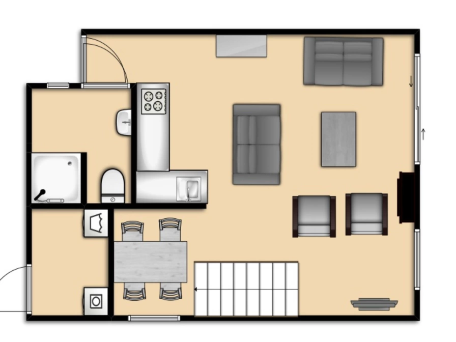 The open kitchen of this detached holiday home is equipped with an oven, dishwasher and microwave. In the living room you will find a sitting area with a fireplace, TV and radio / CD player. There is also a dining area. On the ground floor is a bathroom with a shower and toilet. There is a washing machine and dryer in the storage room. Upstairs are two bedrooms, one with 2 single beds. The other bedroom has 2 single L-shaped beds. This holiday home has a garden with a terrace. Garden furniture is available.
