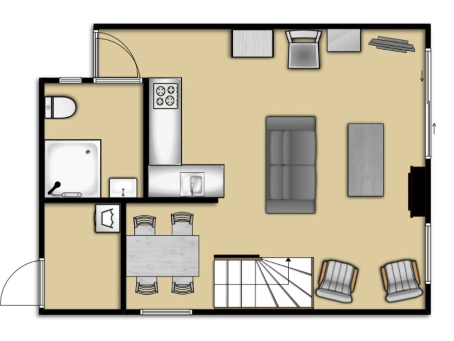 The open kitchen of this detached holiday home is equipped with a combi-oven and dishwasher. The living room has a sitting area with a fireplace, TV and radio / CD player. There is also a dining area. On the ground floor is a bathroom with a shower and toilet. There is a washing machine and dryer in the storage room. Upstairs are two bedrooms, each with 2 single beds. This holiday home has a garden with a terrace. Garden furniture is available.