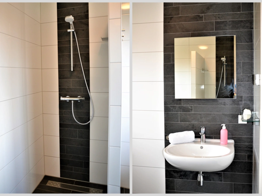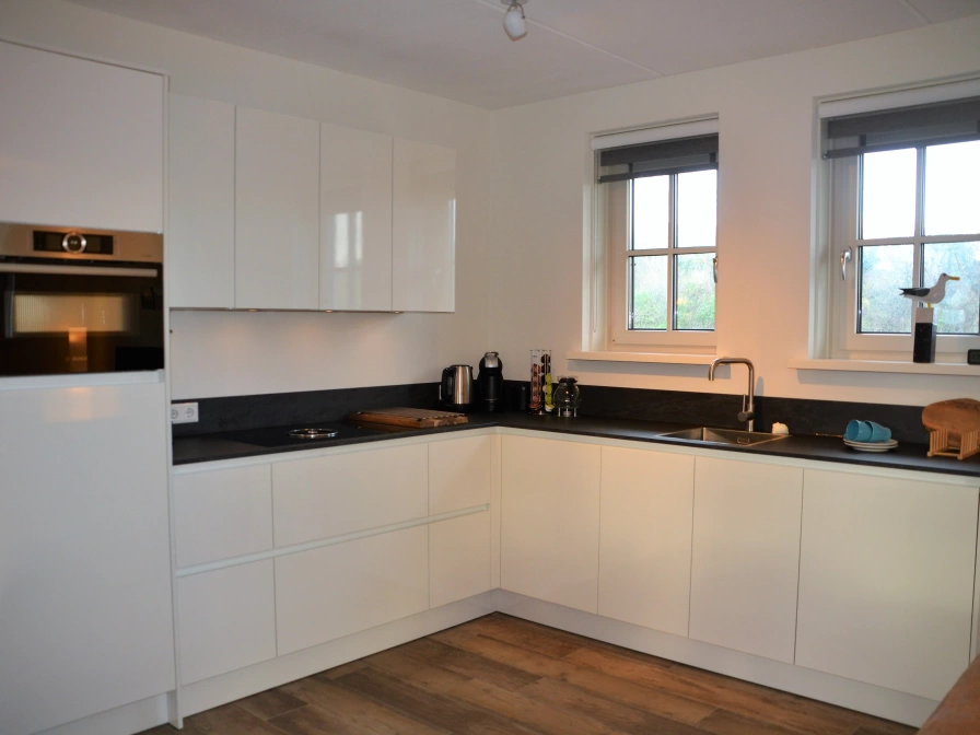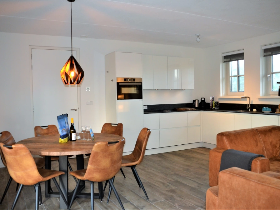 Spacious living room with sitting area and wood stove (bring your own wood). Open kitchen with dishwasher, oven with microwave function, filter coffee machine and Nespresso machine. On the ground floor is a double bedroom with en-suite shower room. On the upper floor are two bedrooms for two persons each and a bathroom with bath and separate shower. French doors to the veranda with terrace.