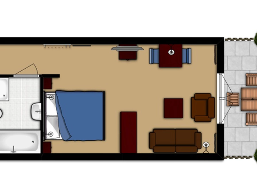 The room has a sitting area with LCD TV and a dining area. A mini fridge and coffee/tea making facilities are provided. The sleeping area has a double box-spring bed. The luxurious bathroom has a bath, shower and toilet. This spacious room has a terrace with seating.
