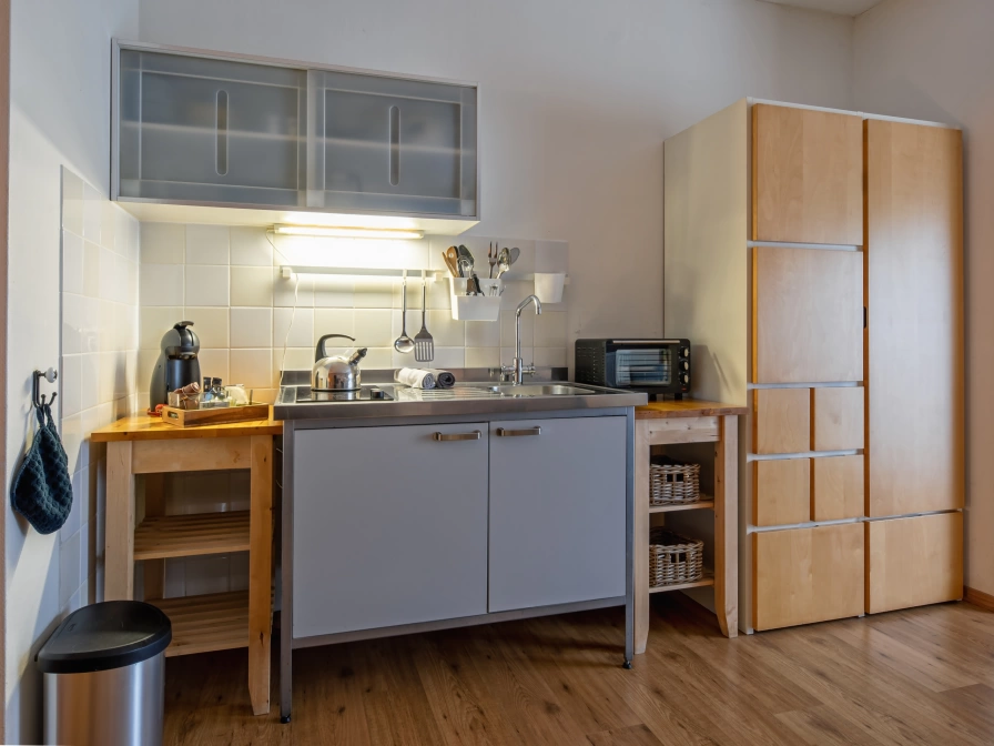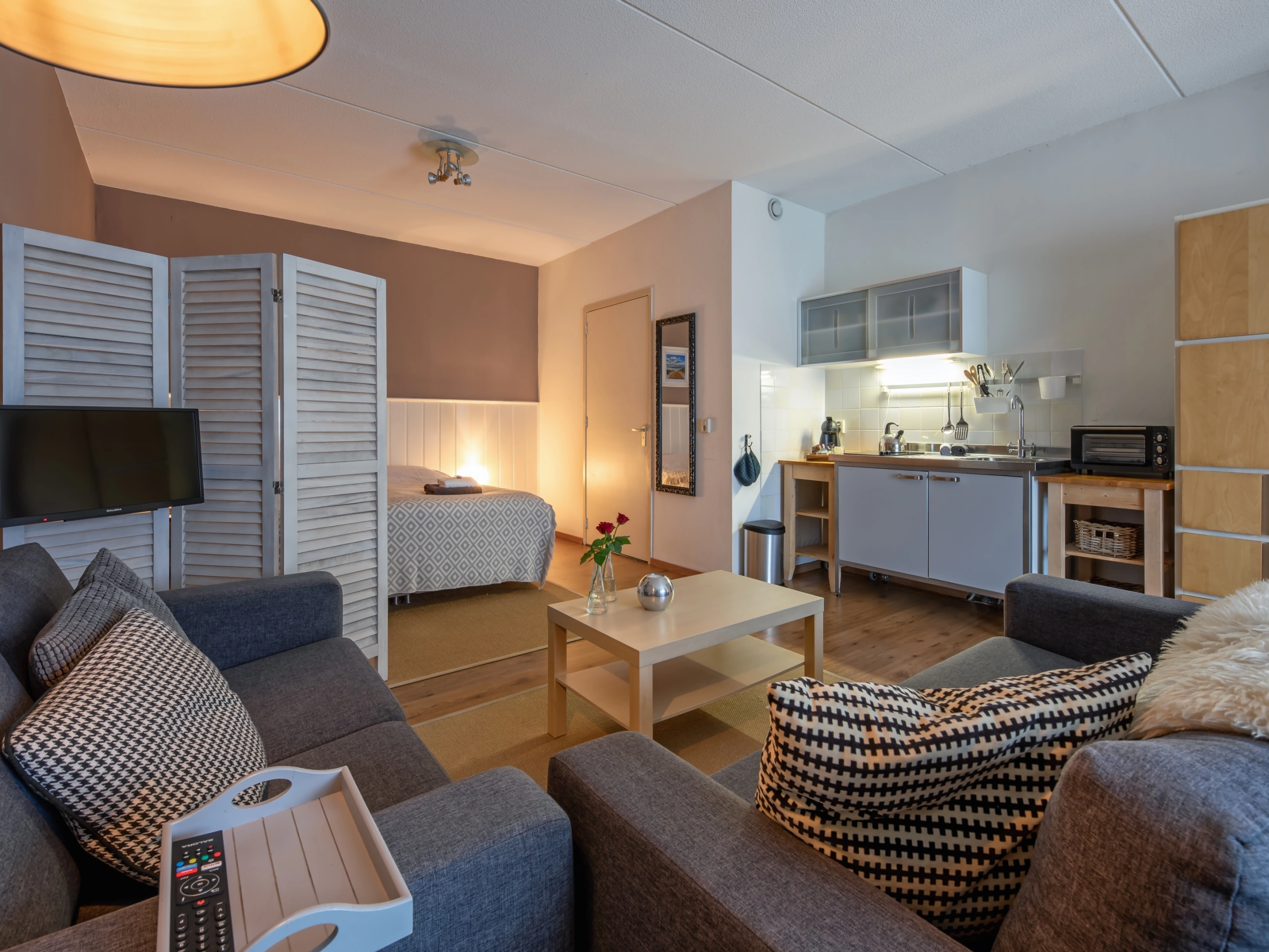 This apartment is on the ground floor. The living room has a sitting area with a 2-person sofa and a 3-person sofa, an LED TV and a dining area with table and 4 chairs. There is an extra wide 2-person box-spring bed in the room (180x200). The kitchenette is equipped with a 2-burner ceramic hob and fridge. The bathroom has a shower and toilet. This apartment has a spacious terrace with a garden on the south. Garden furniture is available.