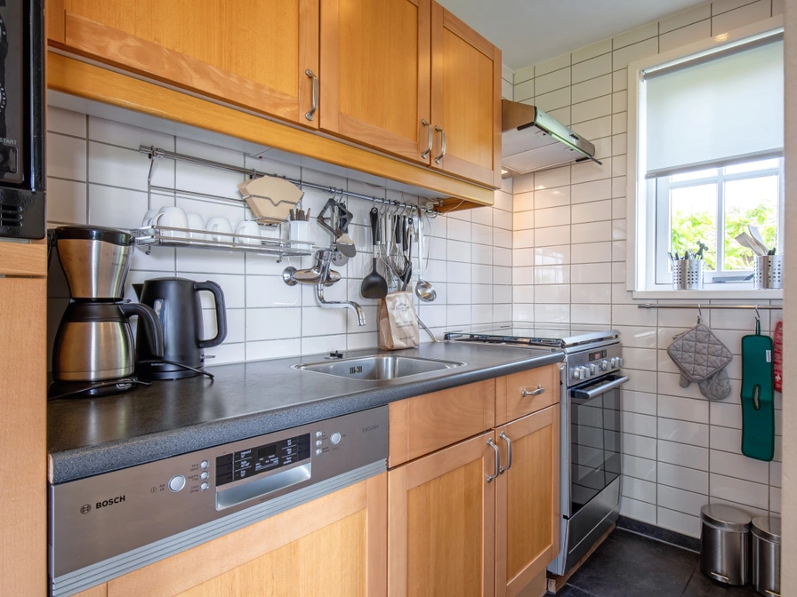 The living room has a dining area and a sitting area with smart TV. The open kitchen is equipped with a gas stove with oven, fridge/freezer, dishwasher, combimicrowave, food processor, toaster, kettle, coffee maker, Dolce Gusto and Senseo. The bathroom is downstairs and has a shower. There is a separate toilet. Upstairs are two bedrooms, one with two single beds and a cot. The other bedroom has two single beds. Both bedrooms have a sink. Holiday home 't Raadsel has a terrace with garden furniture.