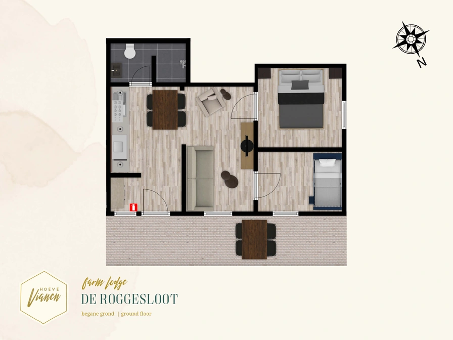 This bright 2-4-person holiday home, located on a beautiful former farm, has a neat open kitchen with, among other things, a combination microwave, filter coffee maker, kettle and dining area. In the adjacent living area there is a seating area with smart TV. Of course, free (fiber optic) WiFi is available. There is a bedroom with a double box-spring bed and a second bedroom with a comfortable bunk bed. The second bedroom can be reached via the first bedroom. The neat bathroom has a shower, sink and toilet. The terrace with garden furniture is located directly on a spacious green garden meadow.