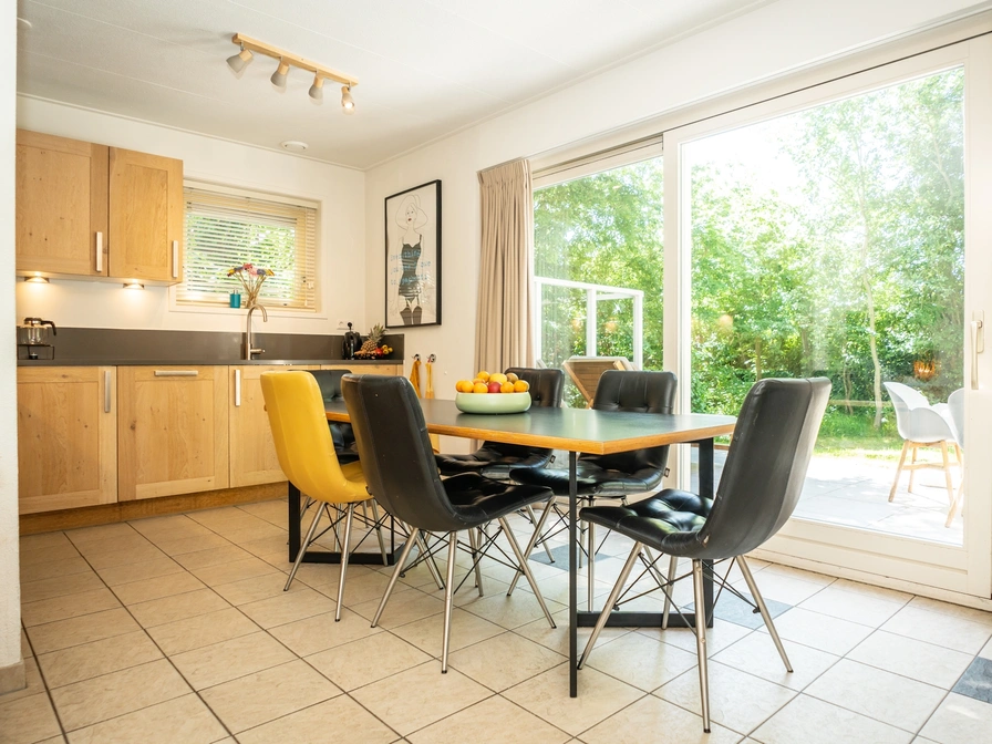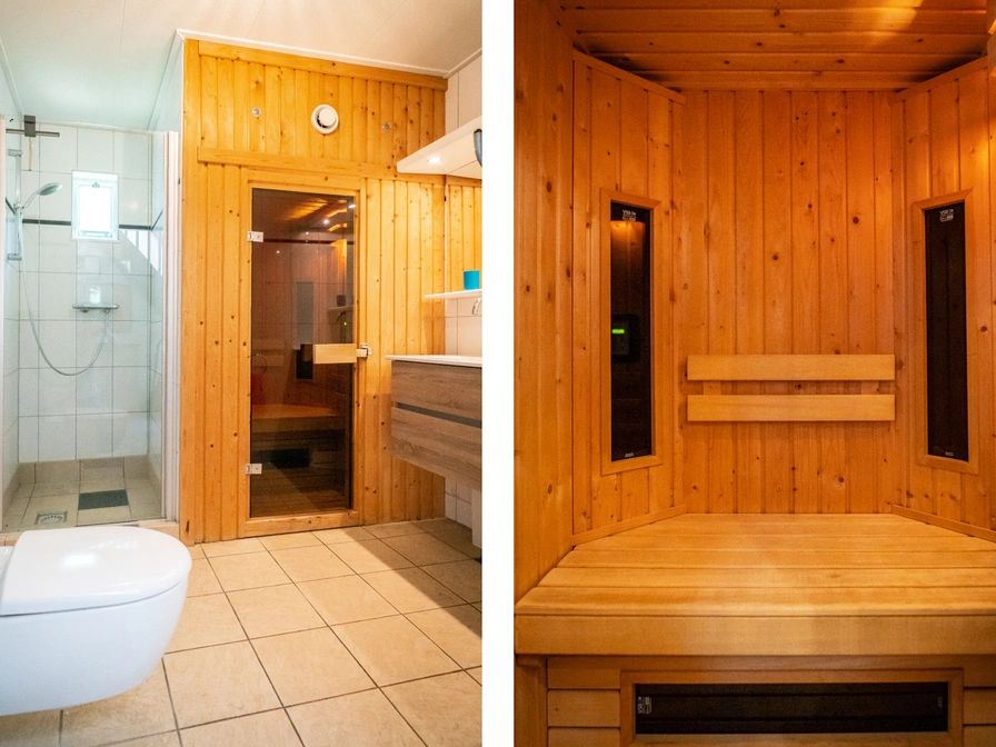 This detached holiday home is quietly located in the park. The living room has a sitting area with a smart TV, DVD player and hi-fi set. There is also a dining area. The open kitchen is equipped with a refrigerator, oven, dishwasher, mixer, blender, coffee maker, Nespresso and Senseo. There is a bedroom with 2 single box-spring beds and a smart TV. The bathroom has a shower, double sink, toilet and a double infrared sauna. The utility room is equipped with an additional fridge freezer, microwave, washing machine and tumble dryer. Upstairs are two bedrooms, each with 3 single box-spring beds. The second bathroom has a shower and toilet. This holiday home has a garden with three terraces. Garden furniture is available.
