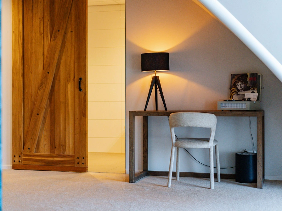 The Wad & Duin suite has a high ceiling and is equipped with a box-spring bed with Texeler duvet and a sitting area with work area and TV. There is a fridge and coffee and tea making facilities. The room has a bathtub. Bathroom with rain shower, sink, toilet, toiletries, shaving mirror, hair dryer, bathrobes and slippers.