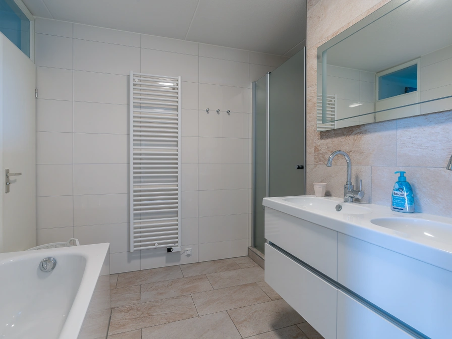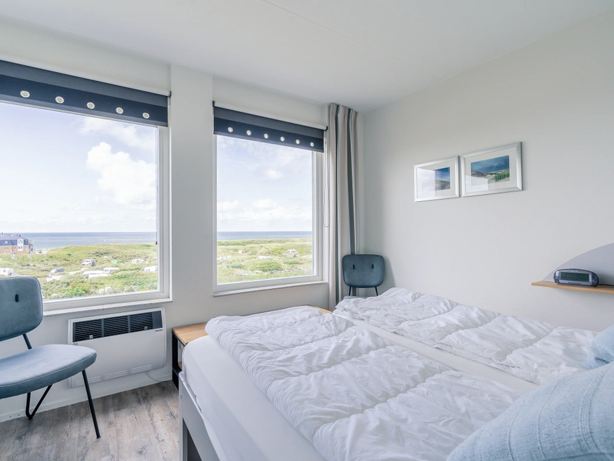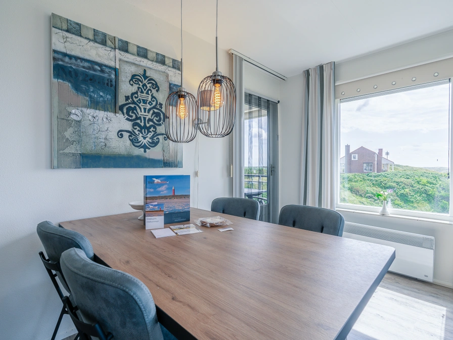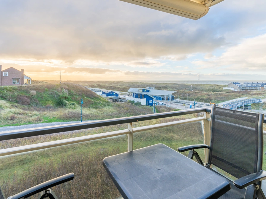 Tastefully decorated 4-person corner apartment on the 1st floor with panoramic views. The spacious living room has a lovely sitting area with TV and a dining area with dining table for 4 people. From the living room you have a view over the dunes and the North Sea. The neat open kitchen is fully equipped, including a dishwasher, combination microwave, fridge-freezer and various coffee machines. There are 2 bedrooms, both with two single box-spring beds. In the largest bedroom you have a beautiful view of the North Sea from the bed. The spacious bathroom has a bath, shower and double sink. The toilet is located separately. From the balcony you have a beautiful view of the seaside resort of Koog, dunes and the North Sea. Balcony with a view over the Koog, the dunes and the North Sea. Garden furniture is available.