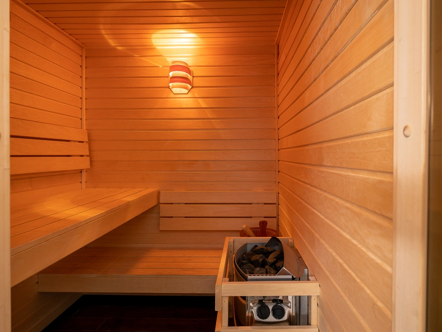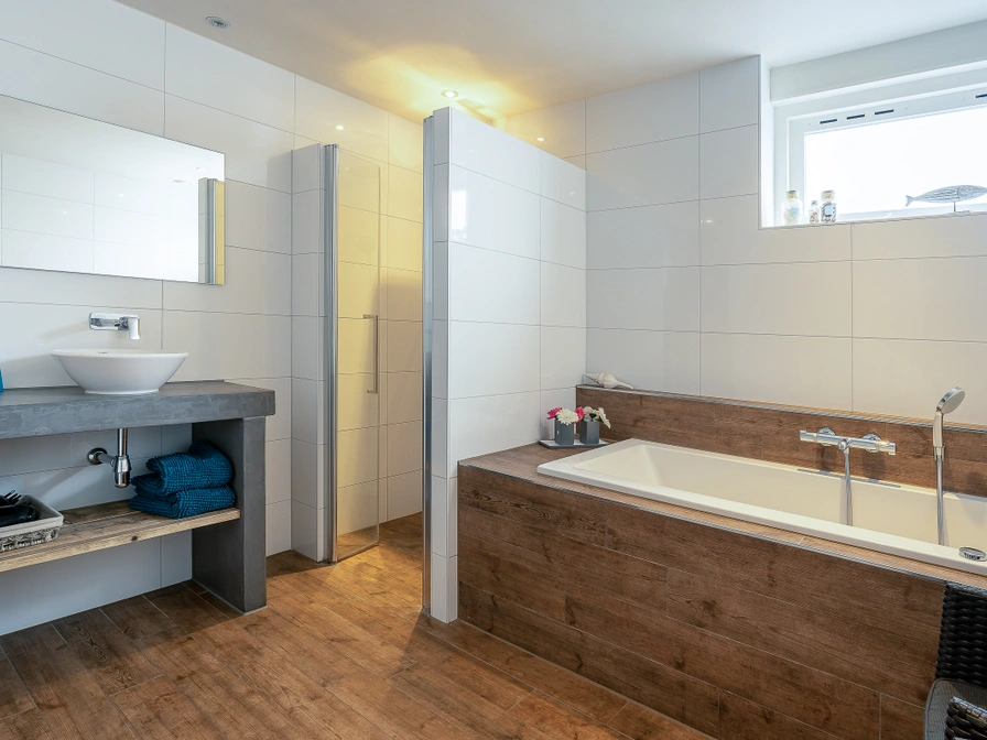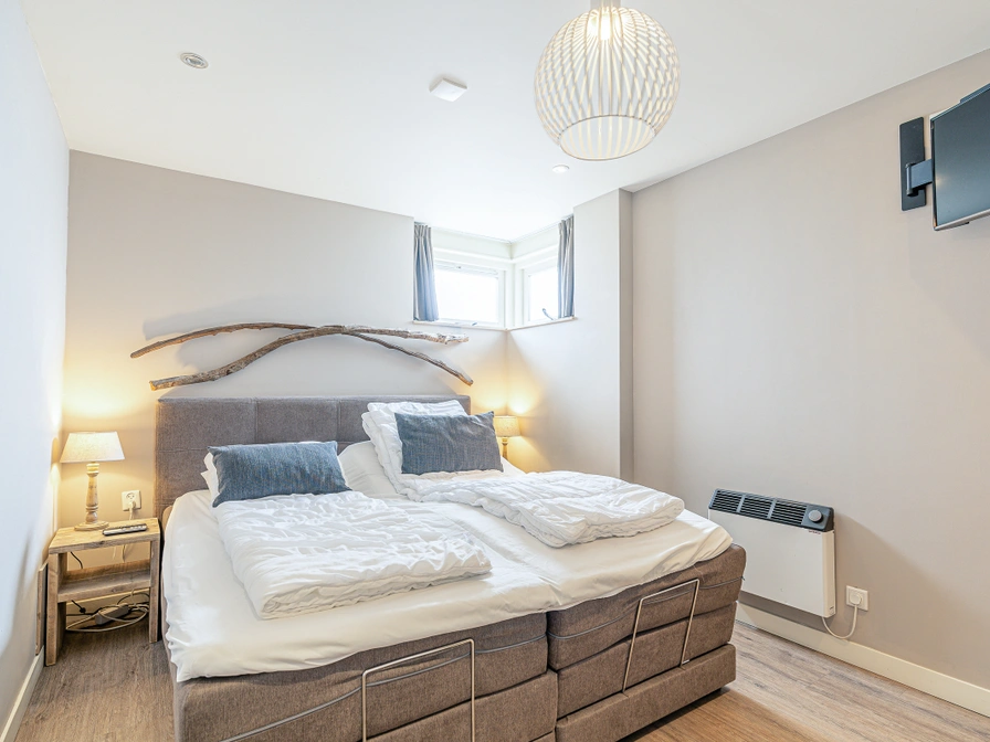 Entrance, cozy living room with a sitting area with TV and a dining area with a dining table for 4 people. The luxurious open kitchen is fully equipped with all modern built-in appliances such as a dishwasher, induction hob, combination microwave, fridge-freezer and various coffee machines. The bedroom is equipped with a comfortable double box-spring bed and TV. The modern bathroom has a walk-in shower with rain shower, whirlpool, sink and sauna. The toilet is located separately. From the living room you have access to the lovely terrace with a lounge set. You can admire the sunrise from the terrace.