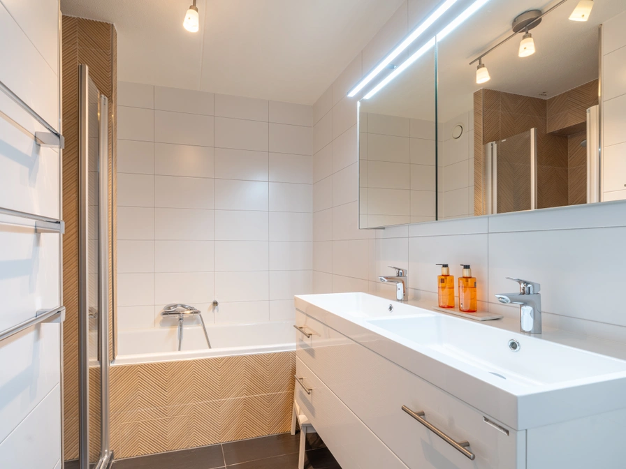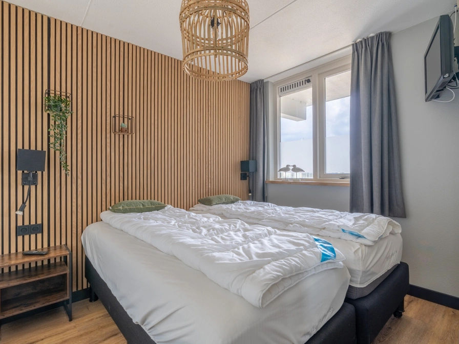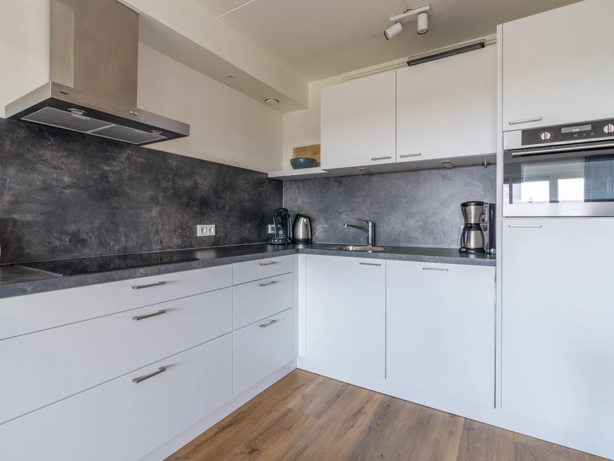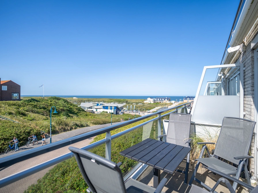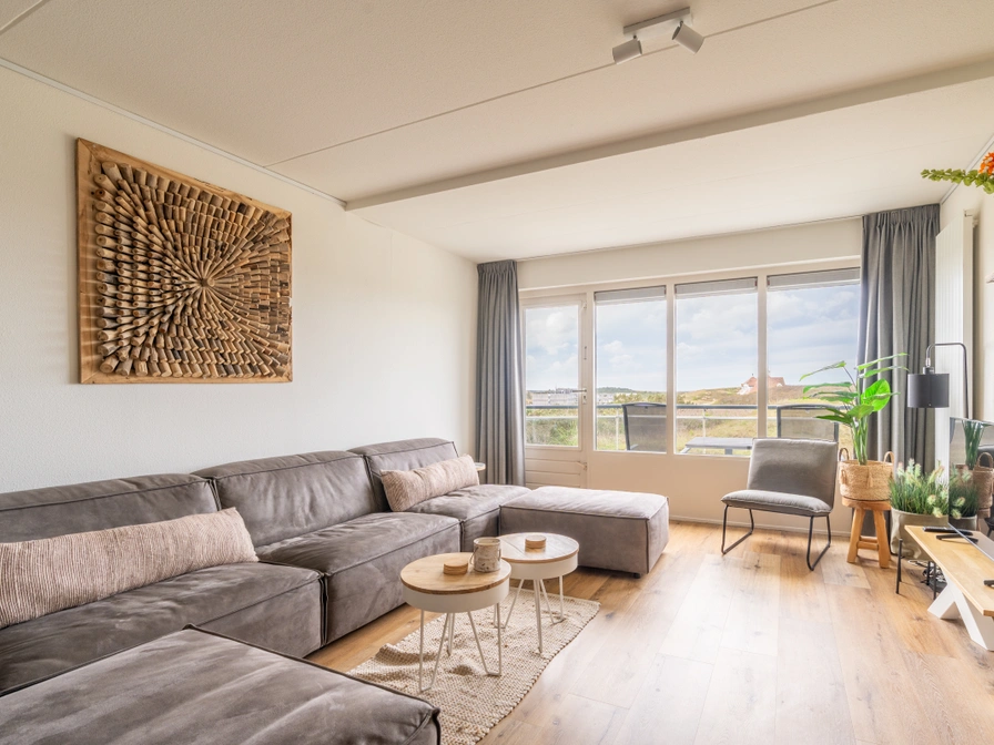 Entrance, attractive living room with a sitting area, TV and a dining area with dining table for 4 people. The neat open kitchen is fully equipped, including a dishwasher, combination microwave, fridge-freezer and various coffee machines. There are two bedrooms, both of which have 2 single box-spring beds. The small bedroom is located in the middle of the apartment and therefore does not have a window with a view outside. The bathroom is equipped with a bath, shower and double sink. The toilet is located separately. From the balcony with garden furniture you have a beautiful view of the North Sea, the dunes and the seaside resort of De Koog.