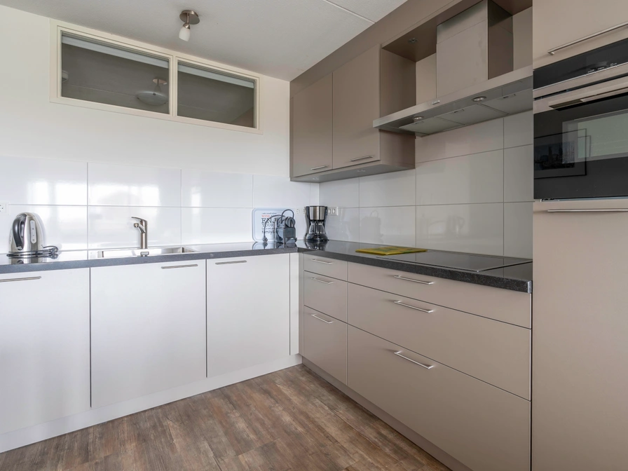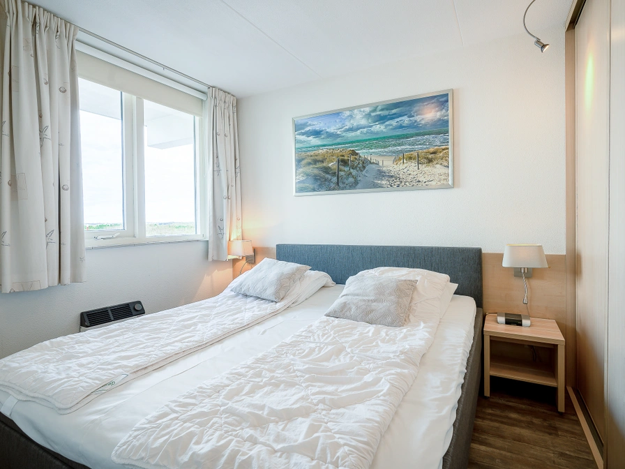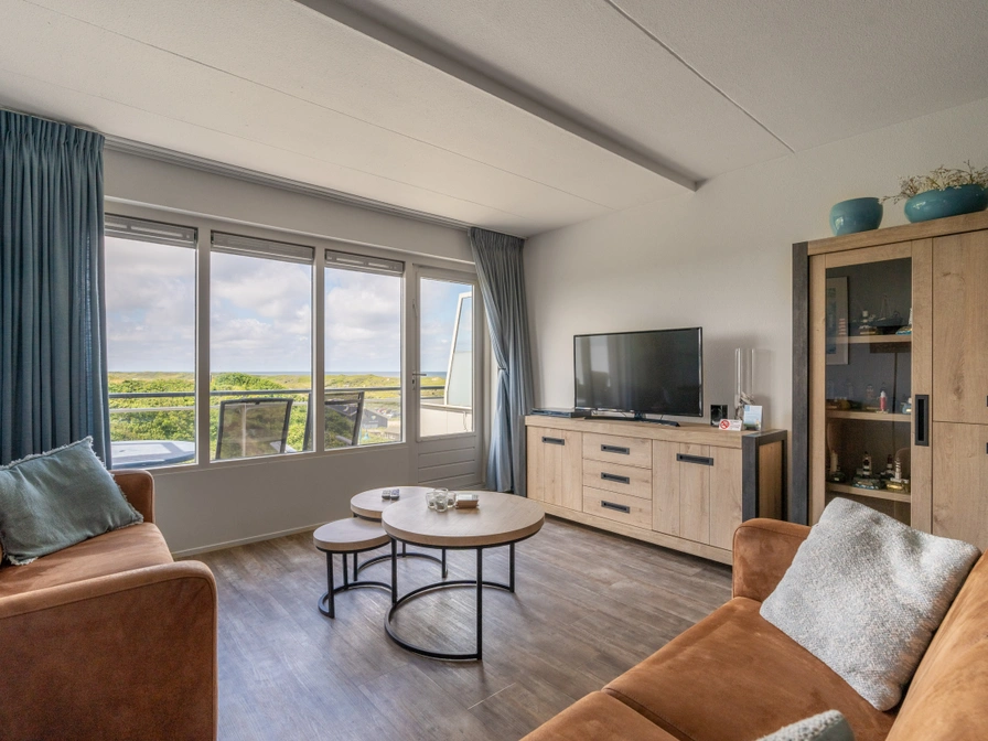 Sea view apartment on the 1st floor. Entrance, spacious living room with a sitting area with TV and a dining area with dining table for 4 people. The neat open kitchen is fully equipped, including a dishwasher, combination microwave, refrigerator with freezer and various coffee makers. There are 2 bedrooms. One bedroom has a comfortable double box-spring bed, the other bedroom has two comfortable single box-spring beds and is located in the middle of the apartment, so there is no window with a view outside. The bathroom is equipped with a bath, shower and sink. The toilet is located separately. The balcony is south-facing and offers a beautiful view of the North Sea, the dunes and the seaside resort of De Koog. Garden furniture is provided as standard.