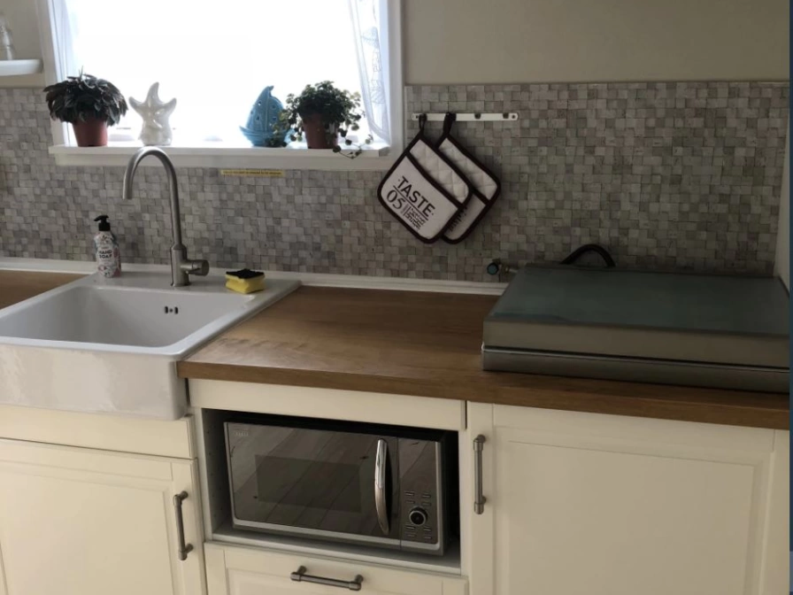 The kitchen is equipped with a 4-burner stovetop, microwave, refrigerator with freezer compartment, coffee maker, and kettle. There is also a dining area. There is a separate living room with a sitting area with a sofa bed and a flat-screen TV. The cozy bedroom has two single box-spring beds, a TV, and a sink. The bathroom has a shower. There is a separate toilet. The holiday home has a spacious, sheltered garden with garden furniture.