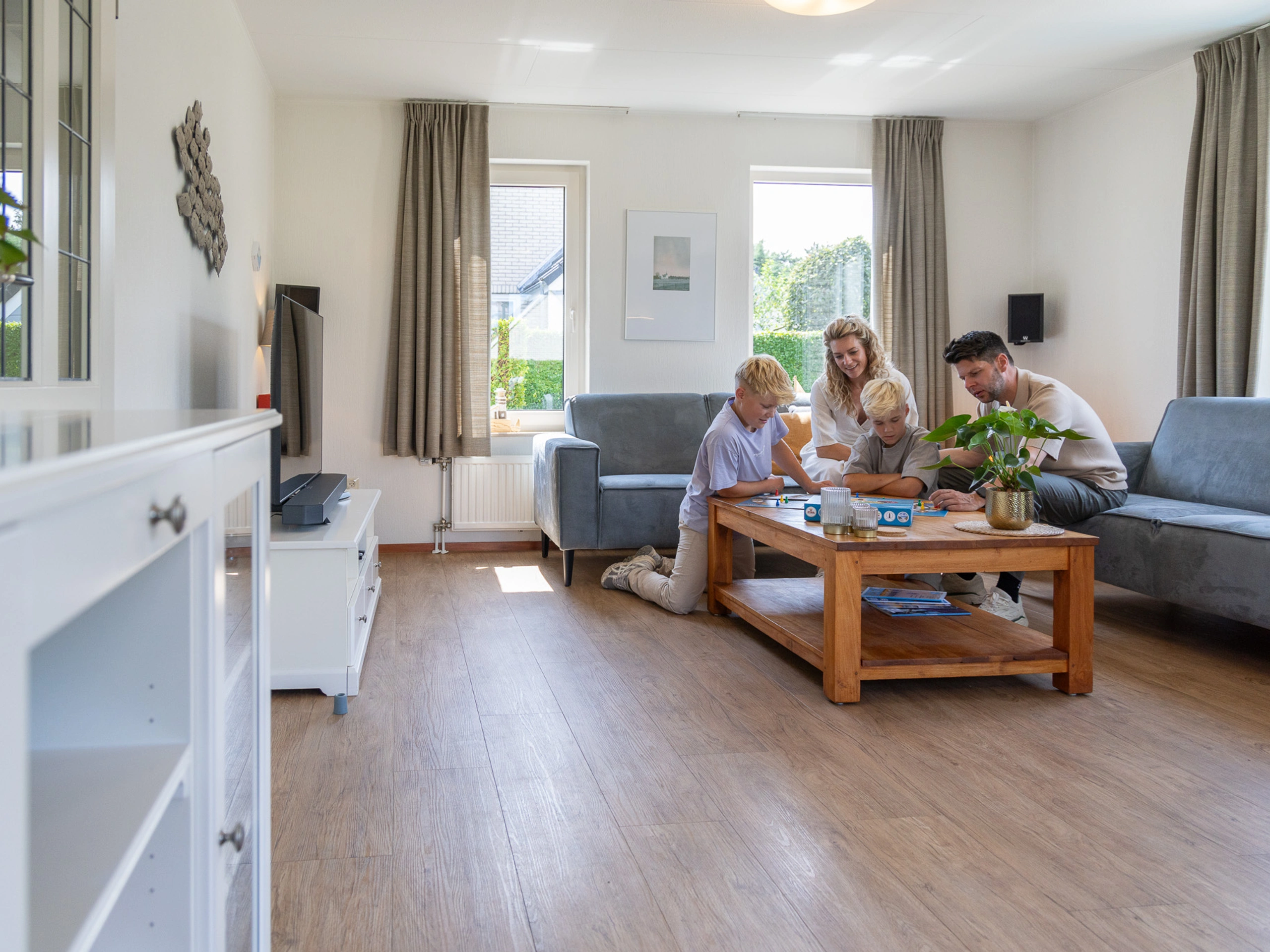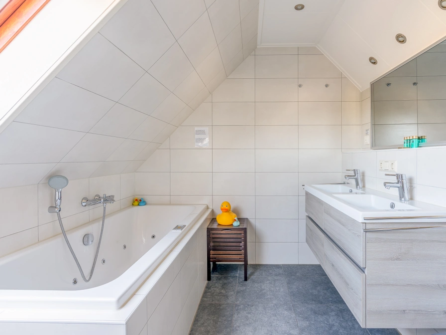 The living room of this detached holiday home has a sitting area with a fireplace, digital TV and blueray player. There is also a dining area. The open kitchen is equipped with a dishwasher and combination microwave. There is a separate toilet. There is a washing machine and dryer in the storage room. Upstairs are two bedrooms with 2 single beds each and a flat screen TV. The bathroom has a whirlpool, separate shower, sink and toilet. This holiday home has a spacious garden with a west-facing terrace. Garden furniture is available. There is underfloor heating in the house.
