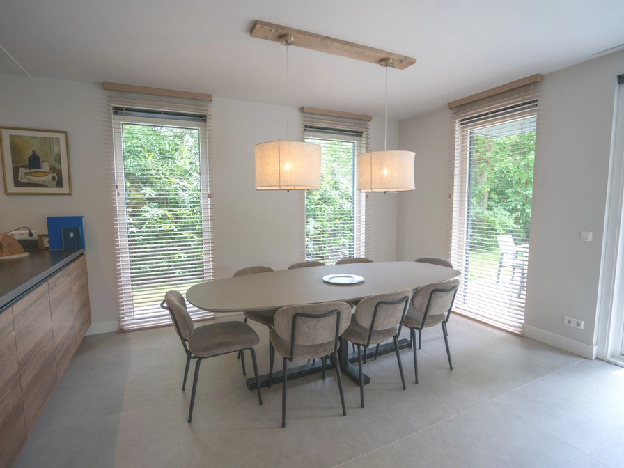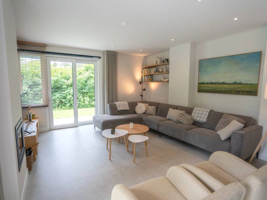 This holiday home has four bedrooms, one on the ground floor and three on the first floor. All bedrooms have two single box-spring beds with single (synthetic) duvets. Adjacent to the downstairs bedroom is a bathroom with a bath, rain shower, and sink. A separate toilet is also located on the ground floor. The living area features a TV corner with a smart TV and cable connection. Wi-Fi is also available throughout the house. In the cozy sitting area, you can use the fireplace in the autumn and winter days. The kitchen is fully equipped with a filter coffee maker, Krups coffee machine, two combination microwave ovens, two refrigerators with freezer compartments, a dishwasher, and an induction cooktop. On the first floor, there are two bathrooms with a rain shower and sink. There is also a second separate toilet. The washing machine and dryer are located in the indoor storage room. Patio furniture and a lounge set are available in the spacious garden. Private parking (with charging station) for up to two cars is available directly at the house. The house is smoke-free.