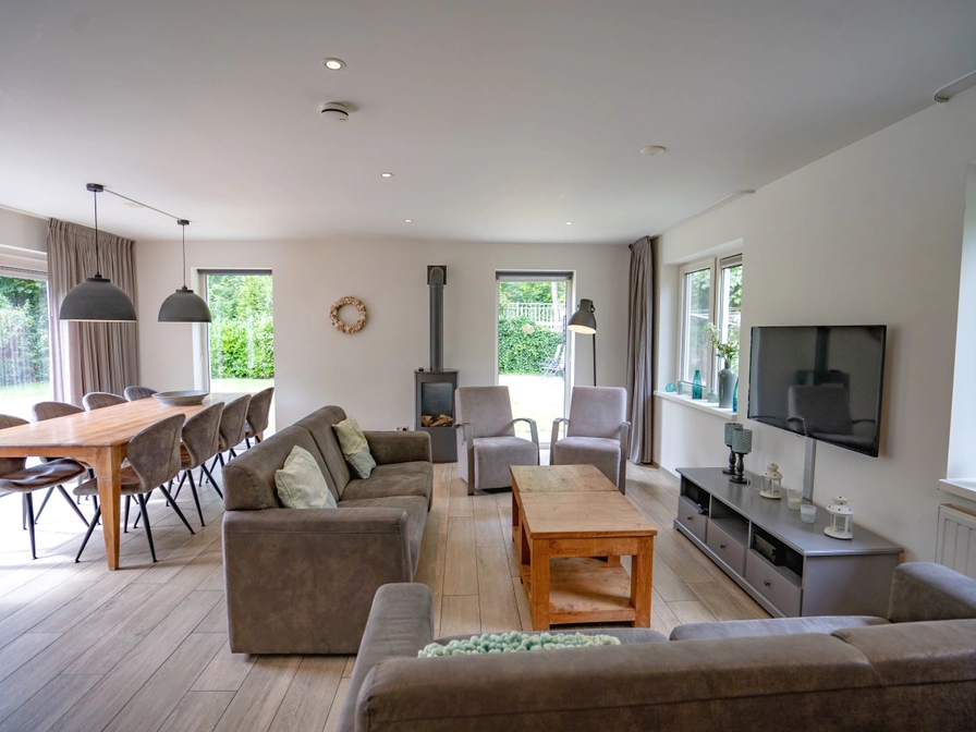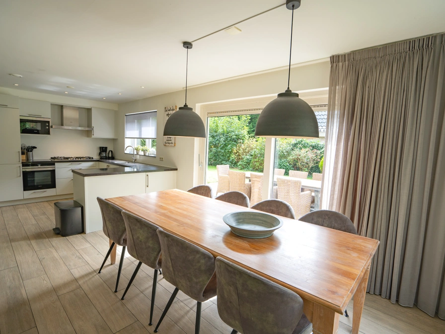 The living room of this luxuriously furnished, detached holiday home has a dining area and sitting area with a gas fireplace, TV, DVD player and stereo. The open kitchen is equipped with a refrigerator with freezer, 5-burner gas hob, coffee maker, microwave, oven and dishwasher. There is a bedroom with 2 single beds. The bathroom has a walk-in shower and sink. The toilet is separate. Upstairs are three bedrooms with 2 single beds each. The second bathroom has a bath, shower and double sink. There is also a separate toilet here. This holiday home has a large, enclosed garden with a south-facing terrace. Garden furniture is available.