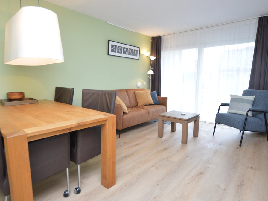 This ground floor apartment has a dining area and a sitting area with TV and CD / DVD player. The open kitchen is equipped with a refrigerator, electric hob, dishwasher and coffee maker. There is a bedroom with 2 single beds. The bathroom has a shower and sink. There is a separate toilet. The apartment has a terrace. Garden furniture is available.