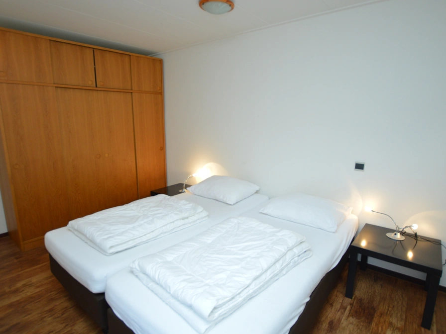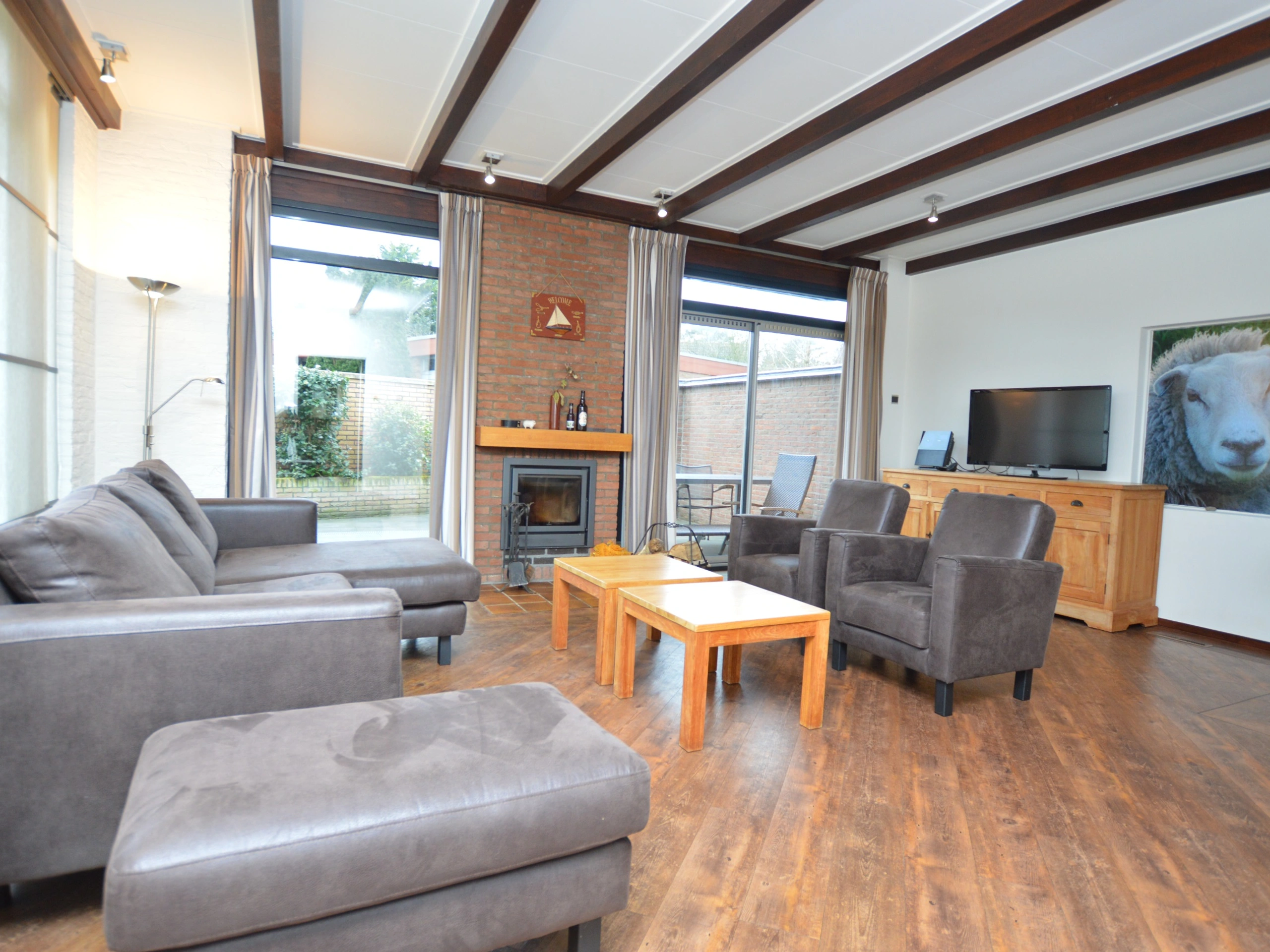 The living room has a dining area and sitting area with a fireplace, TV and stereo. The open kitchen is equipped with a refrigerator, four-burner gas hob, coffee maker, combi microwave and dishwasher. The two bedrooms each have two single box-spring beds. There are two bathrooms, one with a shower, sink and toilet. The other bathroom has a shower and sink. There is also a separate toilet. There is a washing machine and dryer in the storage room. This bungalow has a spacious garden with a south-facing terrace. Garden furniture is available.