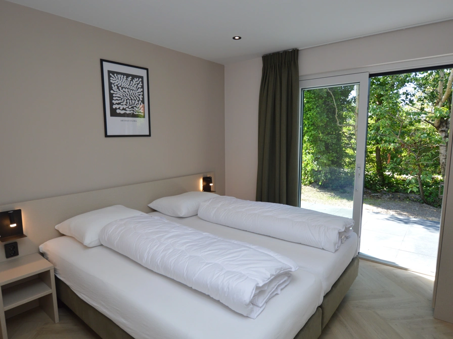 The 4-person bungalow has two bedrooms. The first bedroom has 2 single box-spring beds, 2 single duvets, a wardrobe and sliding doors. The bathroom is ensuite and equipped with a rain shower, sink and toilet. The second bedroom has 2 single box-spring beds, 2 single duvets, wardrobe and an ensuite bathroom with sink and rain shower. The second separate toilet is located in the hall. The living room has a flat-screen TV and a cozy seating area with a two- and three-seater sofa. The fully equipped kitchen is equipped with an oven-microwave, dishwasher, fridge-freezer, coffee maker (filter) and Senseo. Through one of the sliding doors in the living room you enter the sunny terrace and sheltered garden. Washing machine and dryer are located in the hall and there is a private parking space at the bungalow. WiFi is available. There is a lockable garden house with electricity.