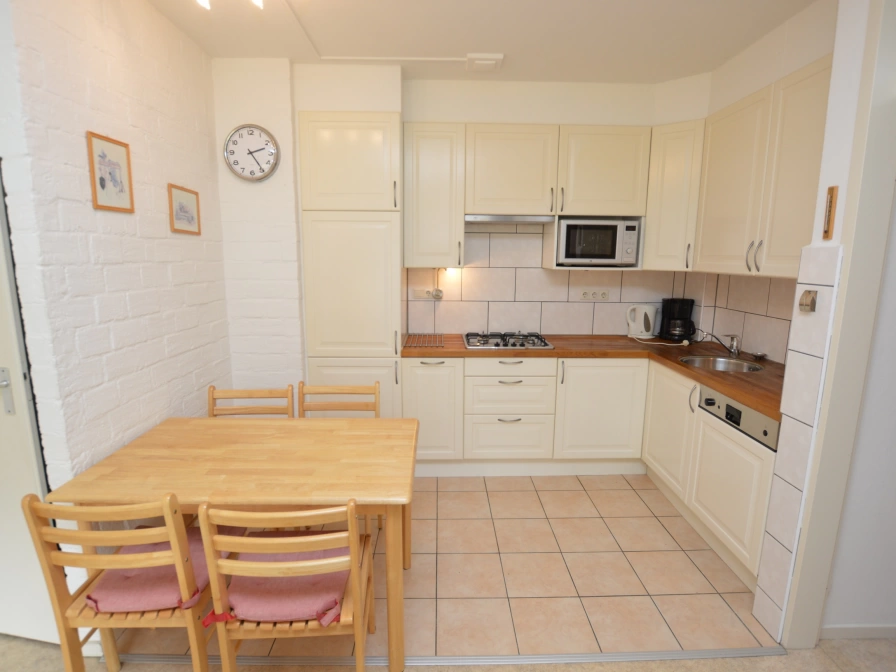 This neat apartment is located on the garden side on the ground floor of the apartment building. The living room has a sitting area with TV. The open kitchen is equipped with a refrigerator, 4-burner gas hob, microwave, dishwasher, coffee maker and dining area. The bedroom has 2 single beds with single duvets. The bathroom has a shower, sink and toilet. This apartment has an enclosed terrace on the west side. Garden furniture is available.