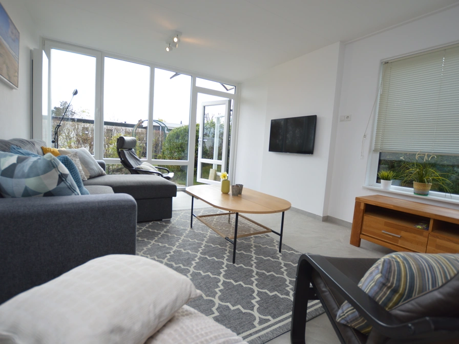 The living room has a dining area and sitting area with TV and stereo. The kitchen is equipped with a gas stove, refrigerator, combination microwave and coffee maker. There are two bedrooms, one with a double bed with two mattresses. The other bedroom has two single beds. The bathroom has a shower and toilet. This bungalow has a spacious garden facing south. The sheltered terrace is equipped with garden furniture.