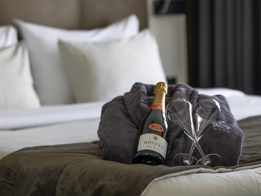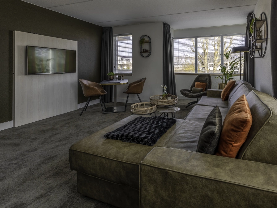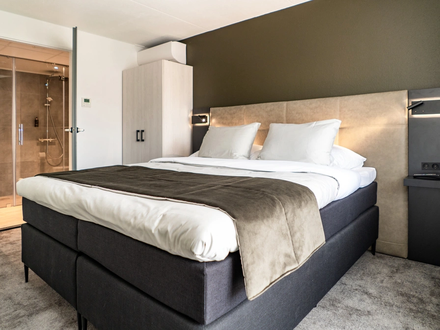 The attractive Grand Suite (50 m2) has its own balcony. The suite is equipped with a luxurious bathroom with underfloor heating, a 2-person steam shower, a sun shower with infrared functions and a wonderful rain shower. The separate bedroom has air conditioning and comfortable box-spring beds (180/210) with a luxury topper. The Suite has a relaxed lounge sofas, table with chairs, Nespresso coffee machine, tea making facilities, stocked minibar (for a fee), laptop safe, bathrobe & slippers, hair dryer, shaving mirror, telephone and two flat screen televisions with chrome cabinet.