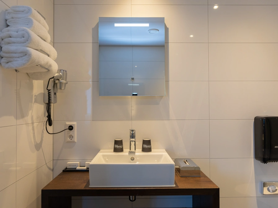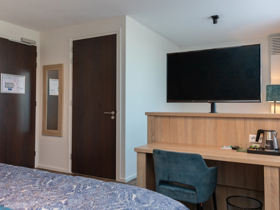 Junior suites without balcony of 25-30 m2 are equipped with a Kingsize bed and sofa bed. The room is equipped with a room divider where the room is divided into two rooms with a nice sitting area, coffee / tea facilities, LED TV, telephone with wake-up service, radio alarm clock, desk / dressing table, safe. Spacious bathroom with shower & toilet. The rooms are accessible by lift.