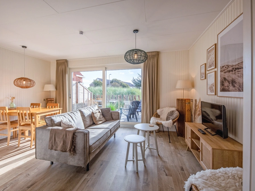 The living room of this comfortable, semi-detached holiday home has a dining area and a sofa with sofa, two armchairs, TV and radio. From the living room you have a view of the terrace and the communal garden. The kitchen is equipped with all basic necessities and furnished with a 4-burner gas stove, refrigerator with freezer, kettle, Nespresso and filter coffee maker. On the ground floor is the bathroom with toilet, walk-in shower and towel radiator. From the hall you reach the upper floor with two bedrooms. The main bedroom has a double bed with two single duvets, a wardrobe and washbasin. The second bedroom has two single beds, a closet and a sink. The beds are made for you on arrival. From the living room you can go to the terrace with garden furniture, located on the south.