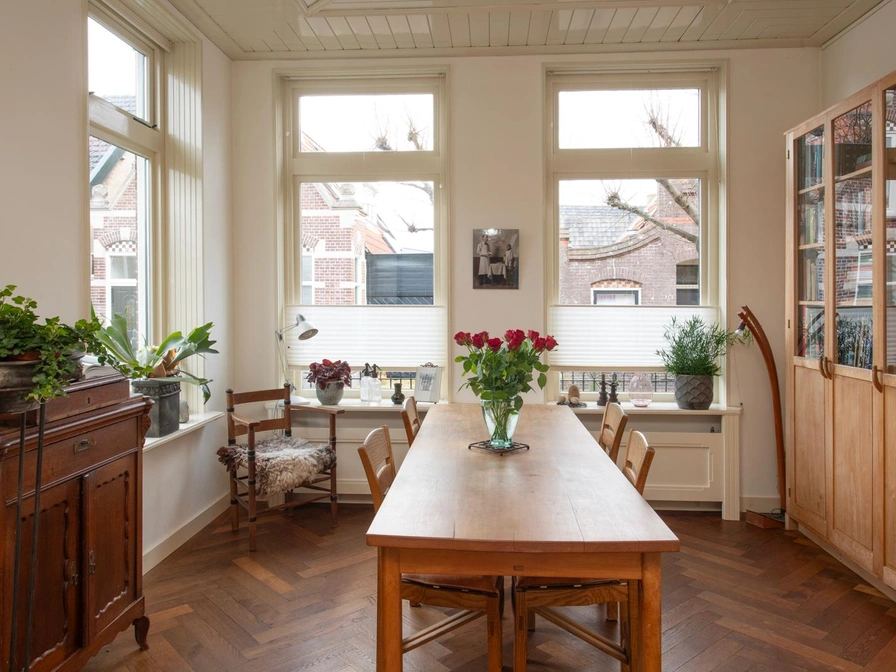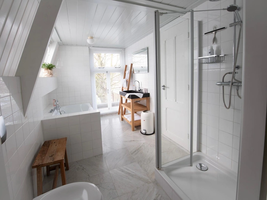 The dining room is on the ground floor. There is also an extra toilet. On the first floor are two guest rooms (11 and 13m2), each with a double bed. The bathroom has a shower, bath, sink and toilet.