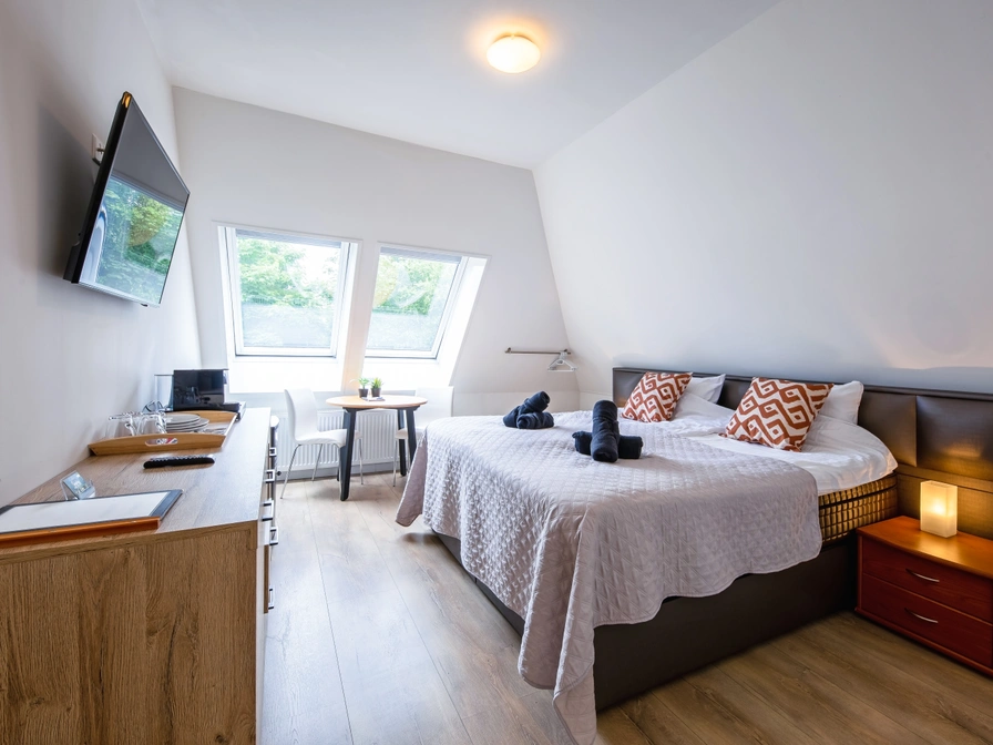 This spacious room has a double bed and digital TV including Netflix. Modern private bathroom with shower, toilet and sink. The room has its own refrigerator. Breakfast is not included and can be ordered upon arrival for a fee. The wellness area with sauna and jacuzzi can be rented on site (per 2 hours).