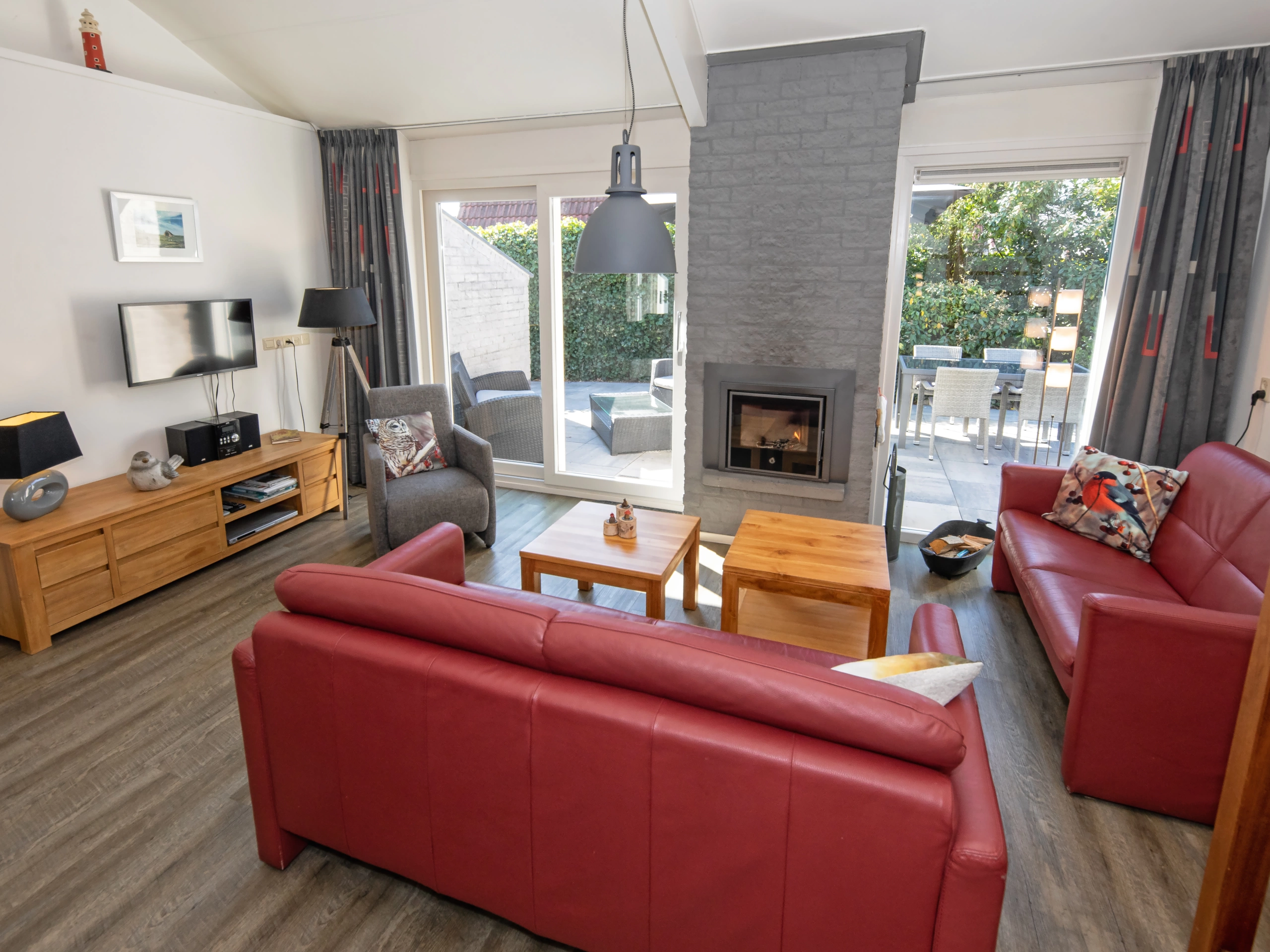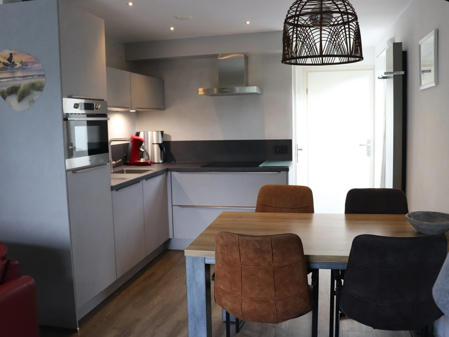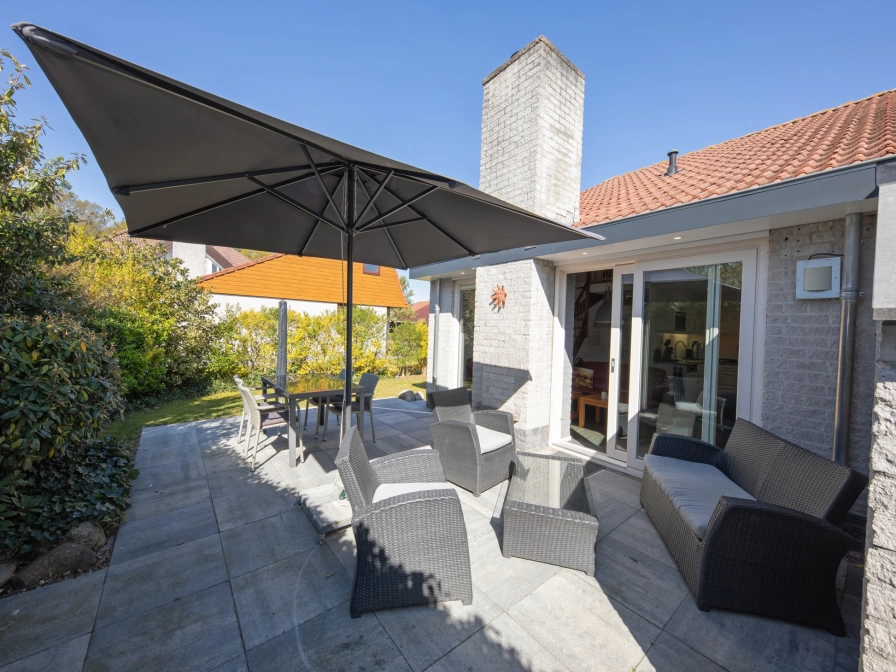 The open kitchen is equipped with a 4-burner gas hob, dishwasher, refrigerator with freezer, combination microwave, toaster, kettle, coffee maker, Senseo and dining area. The living room has a sitting area with fireplace, flat screen TV, DVD player and radio / CD player. There is a bedroom with 1 single box-spring bed. The bathroom has a walk-in shower with sun shower and a sink. The toilet is separate. There is a washing machine and dryer in the storage room. Upstairs are two bedrooms, one with 2 single box-spring beds. The other bedroom has a double bed and washbasin. The holiday home has a private south-west facing garden with garden furniture and a parasol.