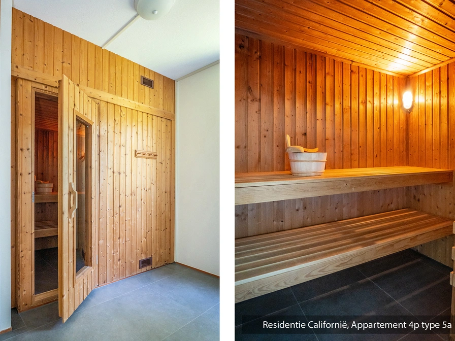 This apartment type 5A has a private sauna and is located on the first or second floor. The living room has a sitting area with TV, radio and CD player. There is also a dining area. The open kitchen is equipped with a 4-burner electric hob and combination microwave. There are two bedrooms with a TV and comfortable beds. The bathroom has a bath, sink, toilet and a separate shower cubicle. This apartment has a balcony. Garden furniture is available. The photos give an impression of the accommodation. The layout and furnishing may differ.