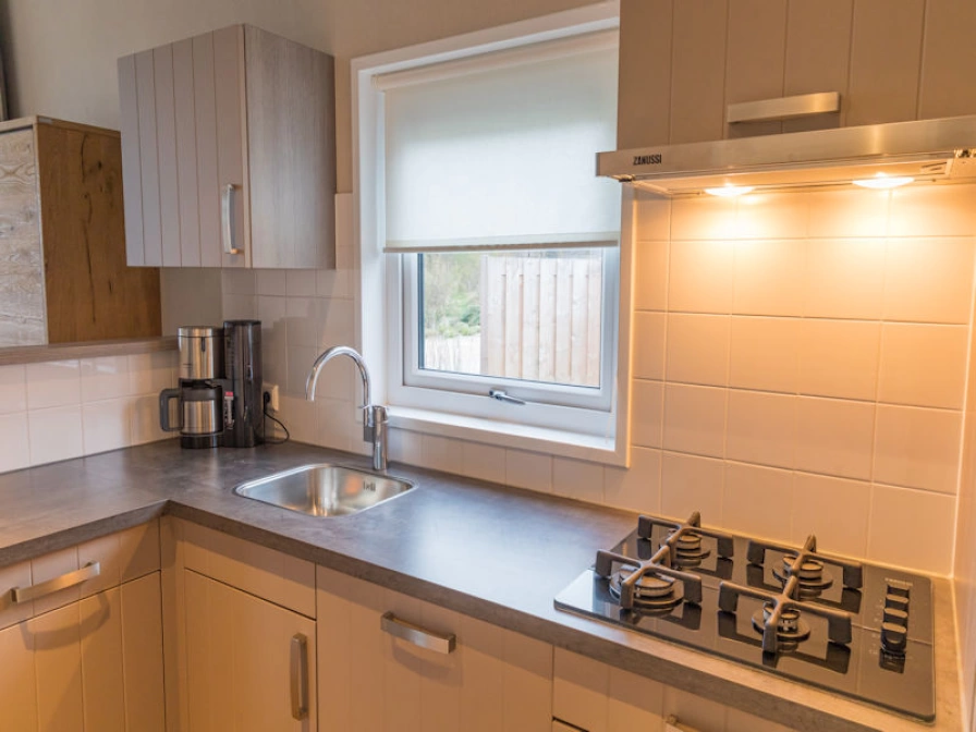 The open kitchen is equipped with a fridge freezer, combi microwave, dishwasher, toaster and coffee maker. The living room has a dining area and a sitting area with a smart TV. There are two bedrooms, each with two single box-spring beds. The bathroom has a shower, sink and toilet. The chalet has a spacious terrace. Garden furniture is available.