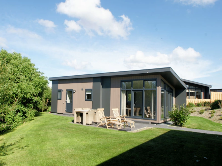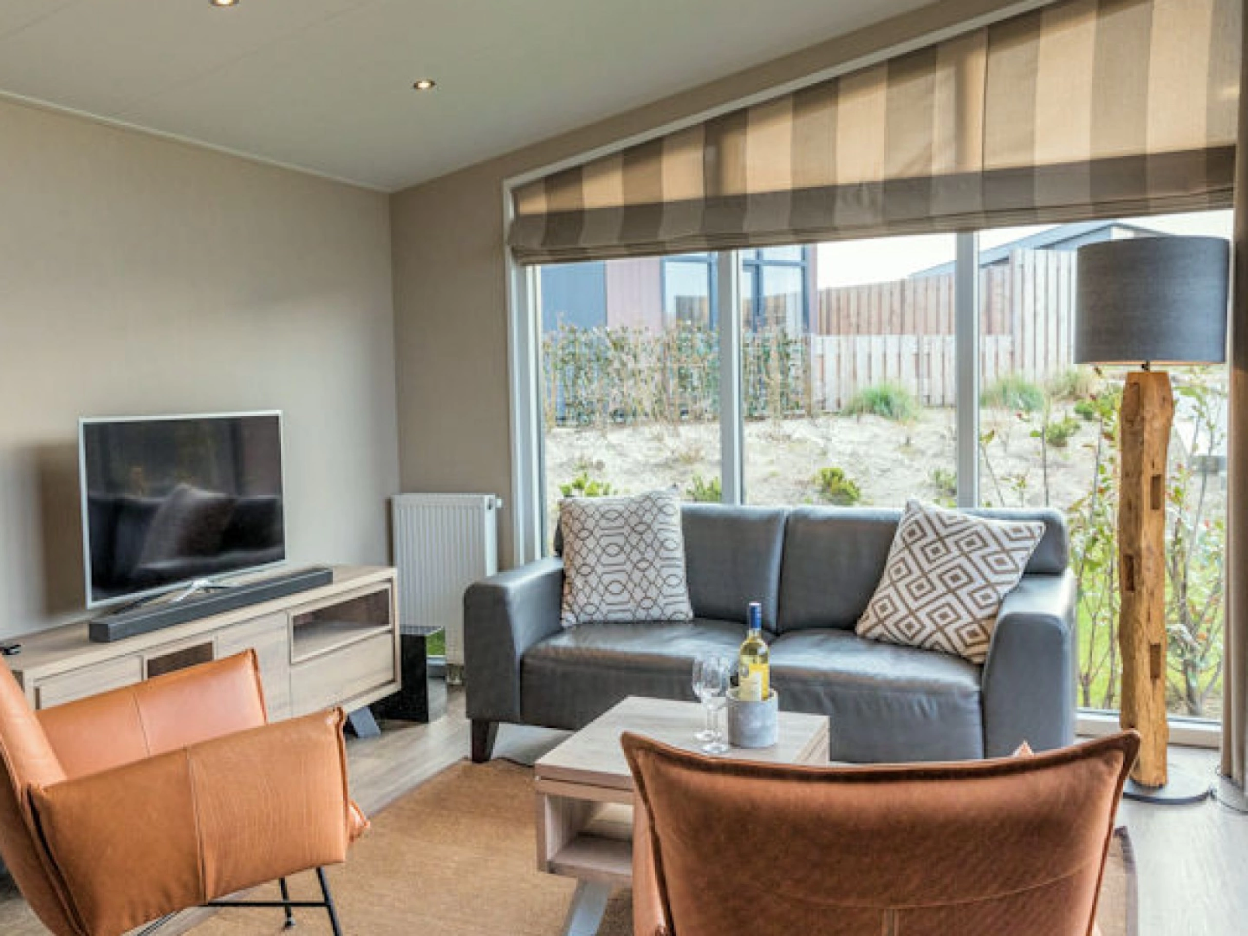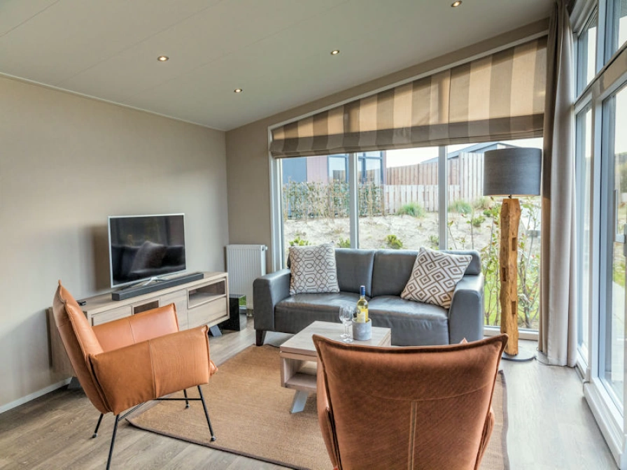 The chalet is quietly located in the dunes of the park. The open kitchen is equipped with a fridge freezer, combi microwave, dishwasher, toaster and coffee maker. The living room has a dining area and a sitting area with LCD TV. There are two bedrooms, each with two single box-spring beds. The bathroom has a shower, sink and toilet. The chalet has a terrace. Garden furniture is available.