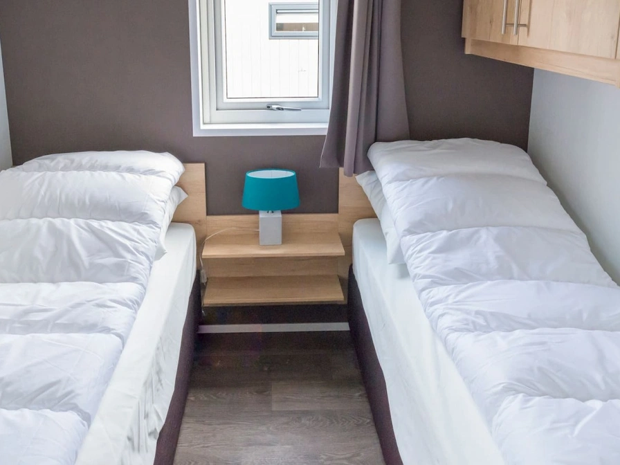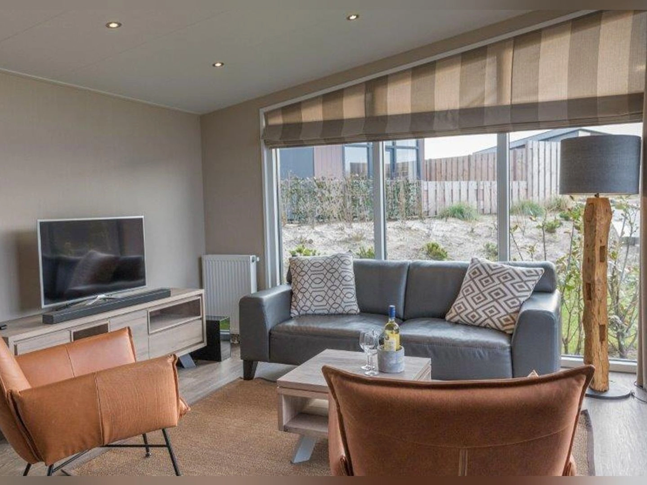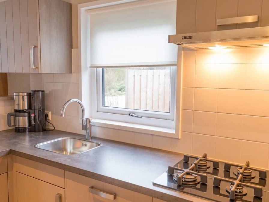 The chalet is quietly located in the dunes of the park. The open kitchen is equipped with a fridge freezer, combi microwave, dishwasher, toaster and coffee maker. The living room has a dining area and a sitting area with LCD TV. There are two bedrooms, each with two single box-spring beds. The bathroom has a shower, sink and toilet. The chalet has a terrace. Garden furniture is available.