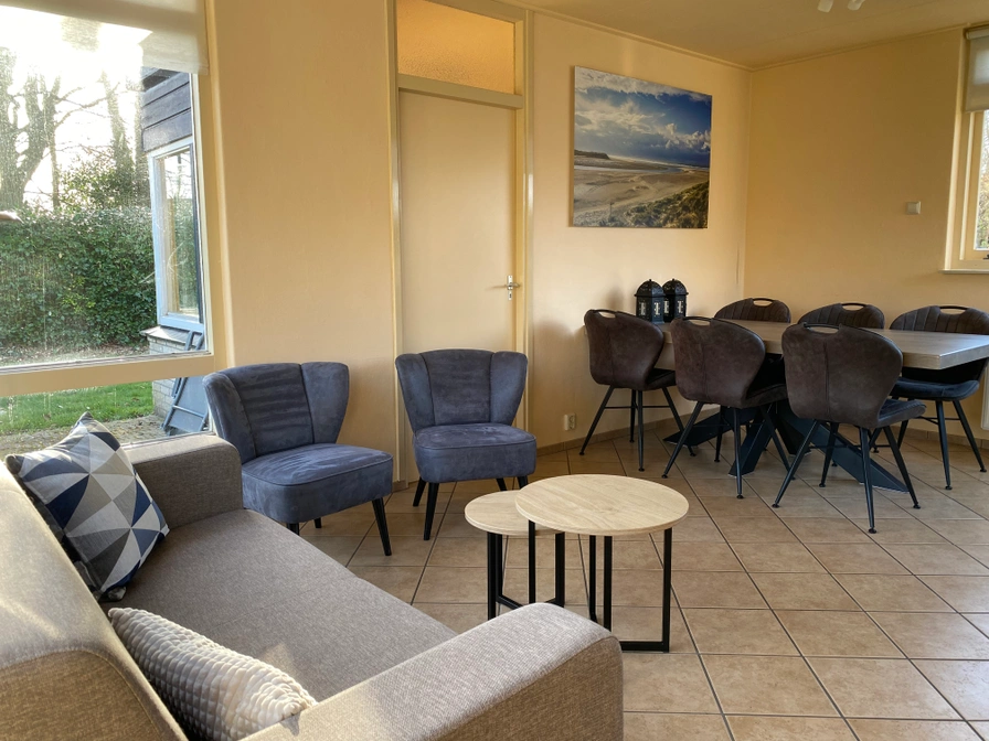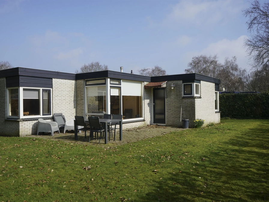 Entrance, living room with sitting area and dining area. Open kitchen with, among other things, a dishwasher. Bedroom with one double bed (160 x 200 cm). Second bedroom with one bunk bed (90 x 200 cm); third bedroom with one double bed (140 x 200 cm). Bathroom with shower, sink and toilet. Around the bungalow you have a spacious lawn with terrace and garden furniture. There is no TV in the accommodation.
