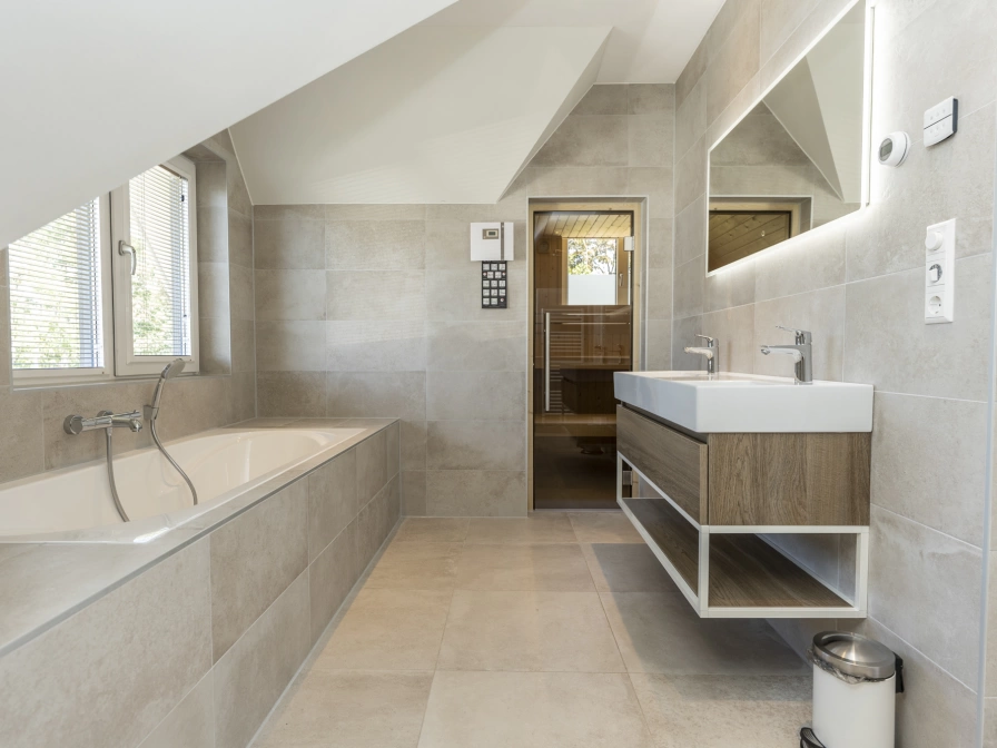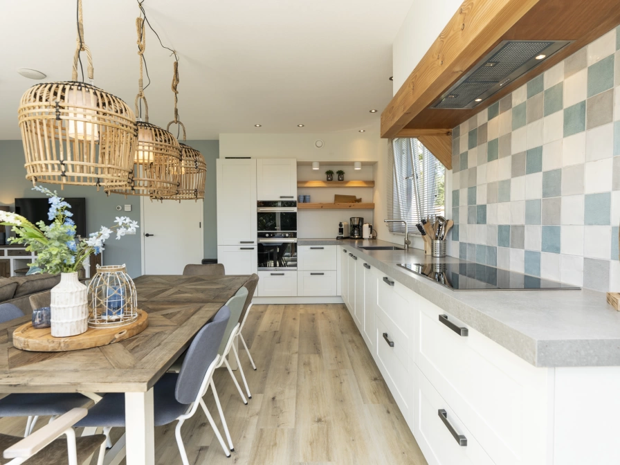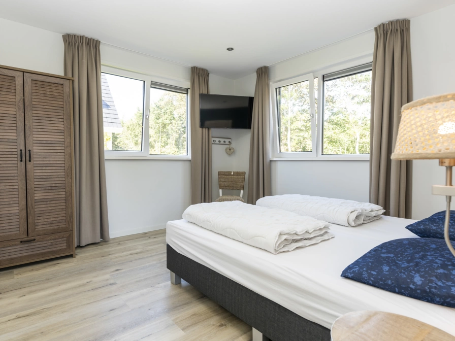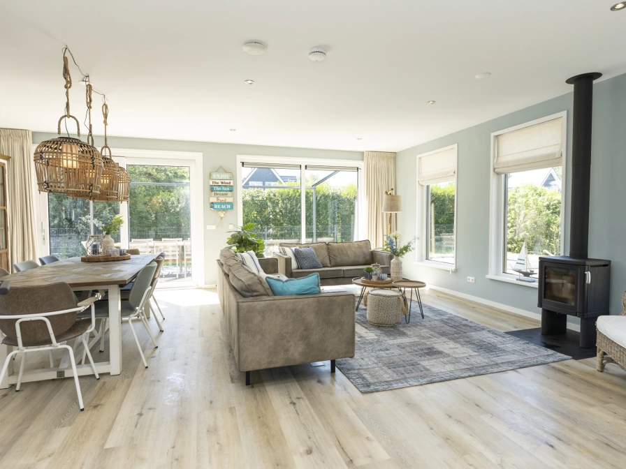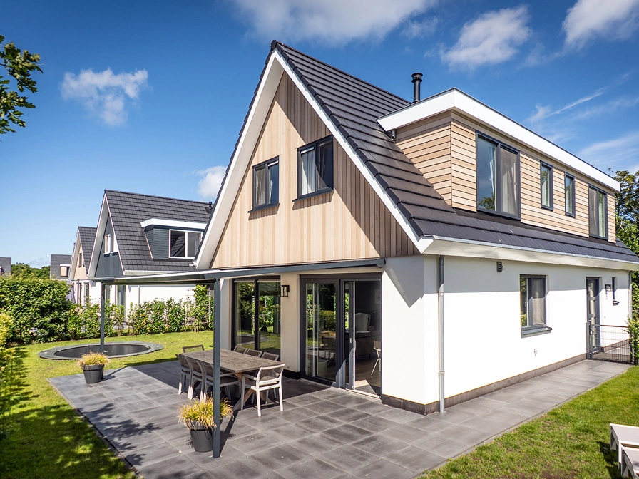 The living room of this detached villa has a dining area and sitting area with wood stove, cable TV and audio set. There is a spacious hall with toilet. The kitchen is equipped with induction hob, fridge with freezer, dishwasher, microwave, oven, coffee maker, Nespresso, kettle and toaster. In the storage room there is a washing machine and a dryer. On the ground floor there is 1 bedroom with two single box-spring beds and a private bathroom with shower and sink. On the upper floor are 3 bedrooms, each with two single box-spring beds. There is a bathroom with bath, shower and sink, separate toilet and a sauna. The villas are energy efficient and are heated with a heat pump. This luxurious villa has a spacious garden with a south-facing terrace. Garden furniture is available. There are synthetic duvets on the beds.