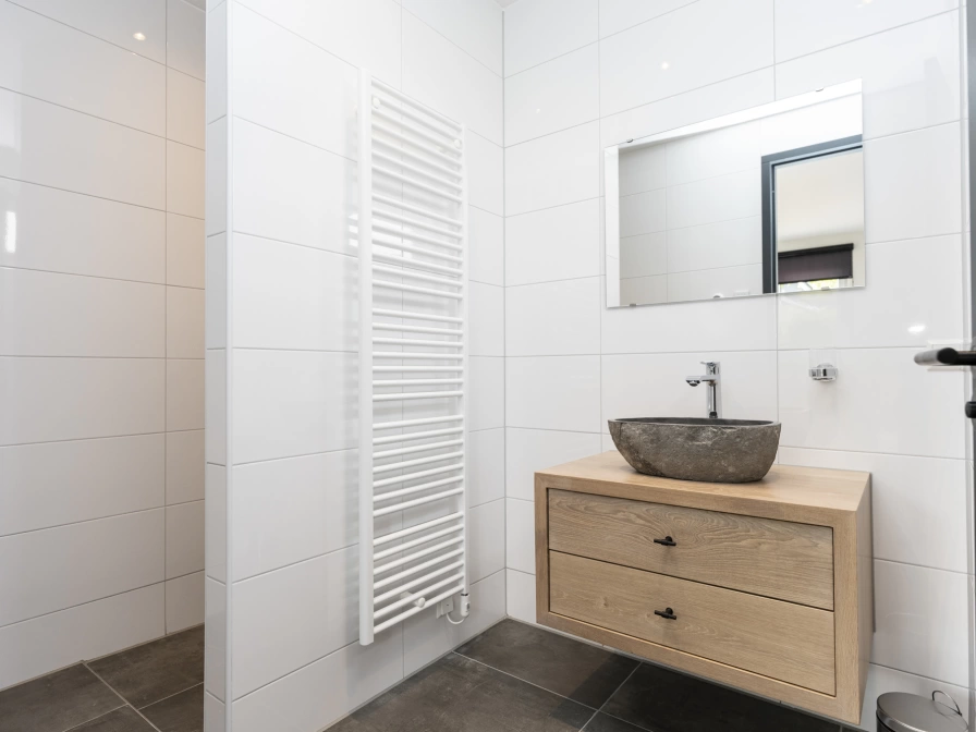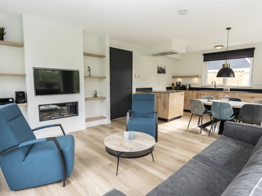 The living room of this detached holiday home has a dining area and a sitting area with an electric fireplace, cable TV and audio set. The kitchen is equipped with an induction hob, refrigerator with freezer, dishwasher, microwave, oven, coffee maker, Nespresso, kettle and toaster. There is a spacious hall with toilet. On the ground floor there is 1 bedroom with two single beds. box-spring beds and a private bathroom with shower and sink. On the top floor there are 2 bedrooms, each with two single box-spring beds. There is a bathroom with bath, shower and sink. There is a separate toilet. There is underfloor heating throughout the house via a heat pump. This holiday home has an enclosed garden with terrace, fixed stone barbecue and private wood-fired hot tub. Garden furniture is available. There are synthetic duvets on the beds.