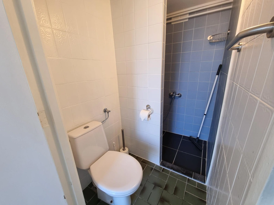 The apartment has a hall upon entry. Straight ahead is the toilet and behind it the shower. You can brush your teeth and wash your hands in the kitchen, which is one door further from the shower and toilet. From the hall you enter the open kitchen and living room. From the living room you walk through to the bedroom with made beds and a spacious closet.
