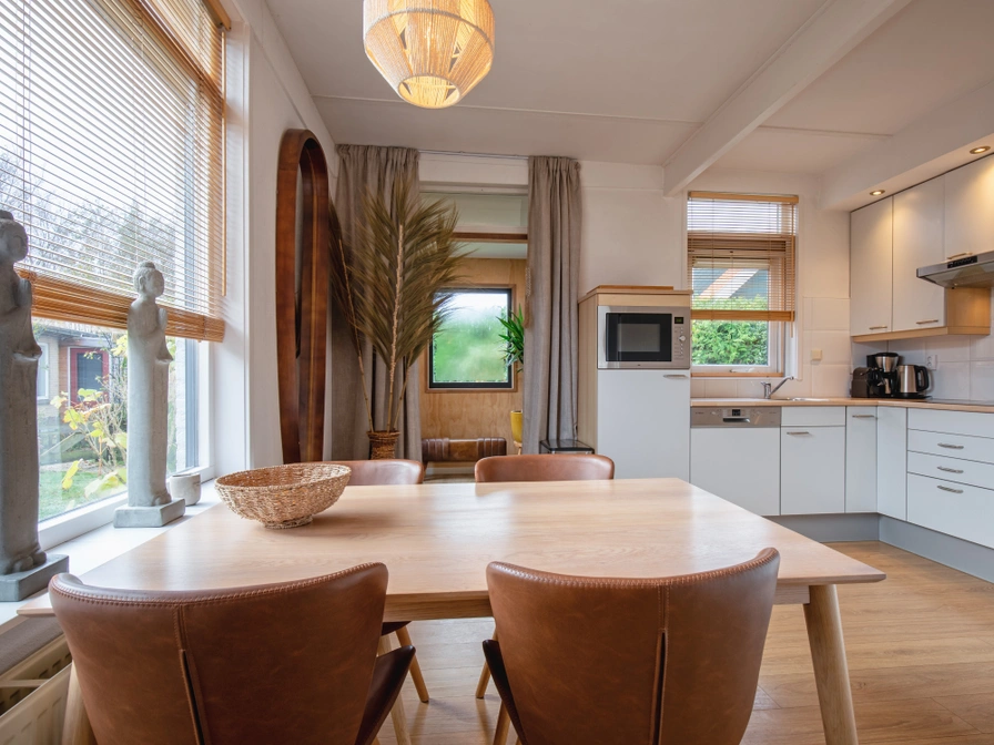 The living room of bungalow De Wijnhof has a sitting area with a wood-burning stove and TV. There is also a dining area. The kitchen is equipped with an induction cooktop with a child lock, a blender, a combination microwave oven, and a dishwasher. There are two bedrooms. The bathroom has a shower and toilet. There is a spacious, secluded garden with a terrace. Garden furniture and two loungers are provided.