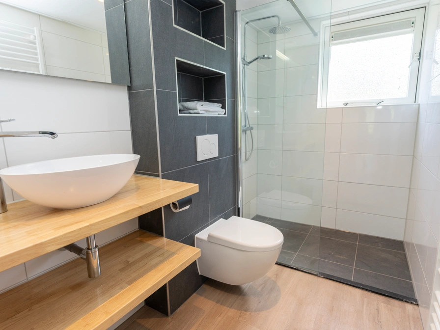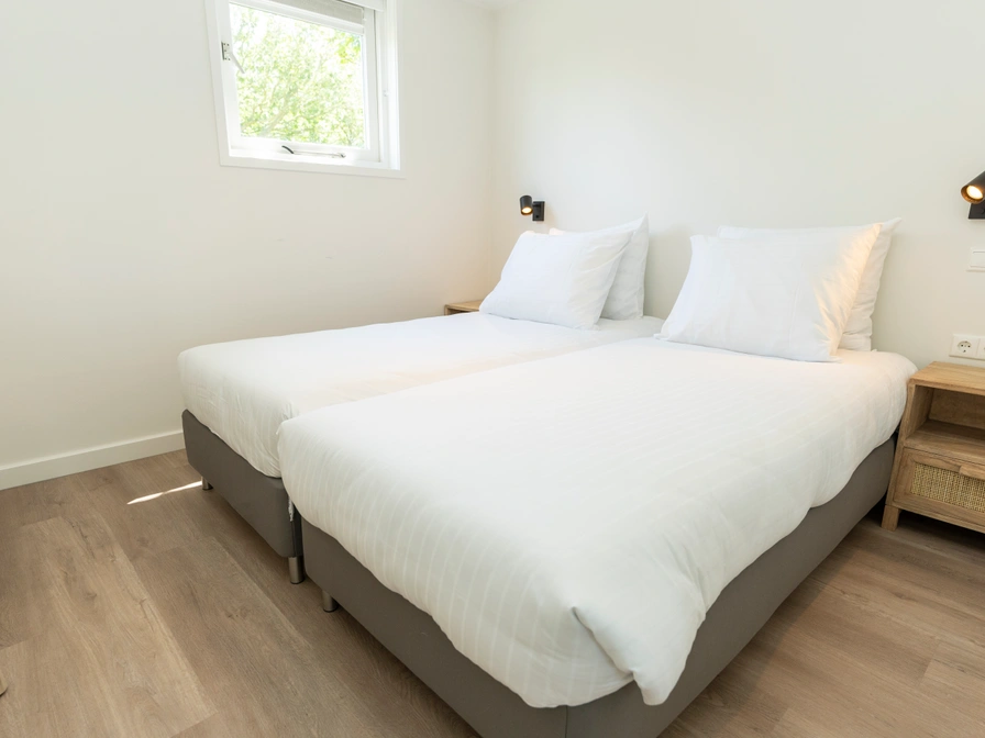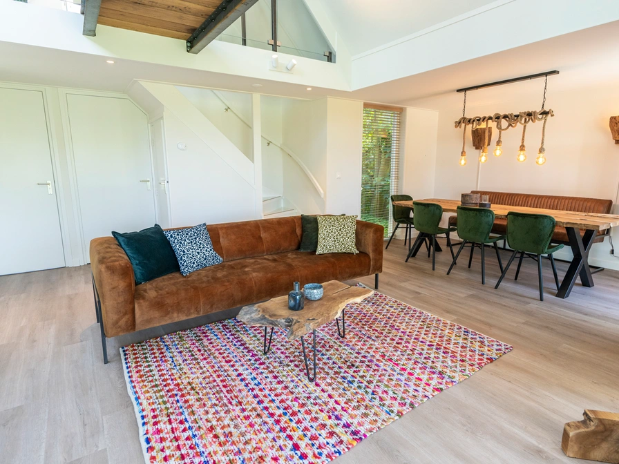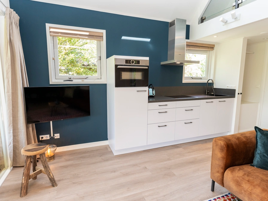 Entrance via the spacious veranda. Living room/kitchen with underfloor heating, sitting area, dining area and smart TV. The open kitchen is equipped with a combination microwave, filter coffee machine and Nespresso machine. The downstairs bedroom has two single box-spring beds. The bathroom has a sink, toilet and shower. On the top floor there are two bedrooms for two people each. One of these rooms can be reached via a walkway above the living room. The veranda has a lounge area. In the shared garden there is a picnic table and a cozy fire pit with a view over the fields.