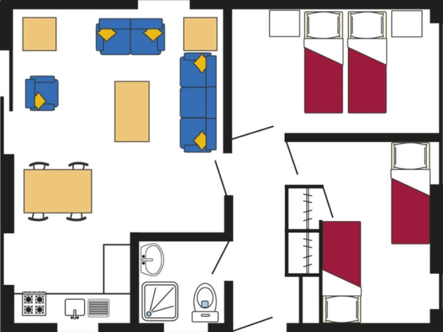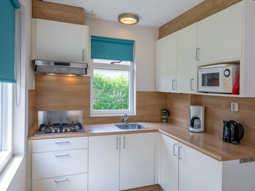 The living room of this bungalow (detached or attached) has a sitting and dining area with TV. The open kitchen is equipped with a 4-burner stove, microwave and refrigerator with freezer. There are two bedrooms, each with 2 single box-spring beds. The bathroom has a shower, sink and toilet. Bungalow type 2 has a terrace with garden furniture.