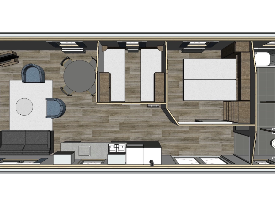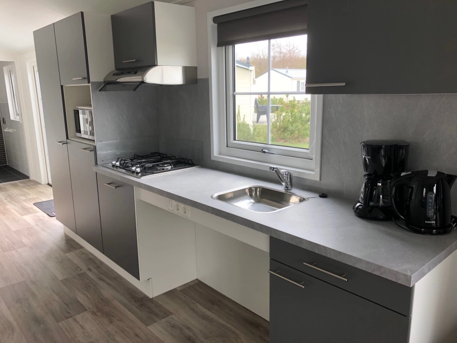 The living room of this detached Villetta adapted for the disabled has a sitting area with TV, radio and a dining area. The (adapted) open kitchen is equipped with a 4-burner stove, extractor hood, refrigerator, microwave and a dishwasher. There are 2 bedrooms with 2 single beds. The bathroom has a bath, shower with seat, sink and a toilet with supports. This mobile home has a ground floor terrace with garden furniture and is easily accessible through the patio doors.