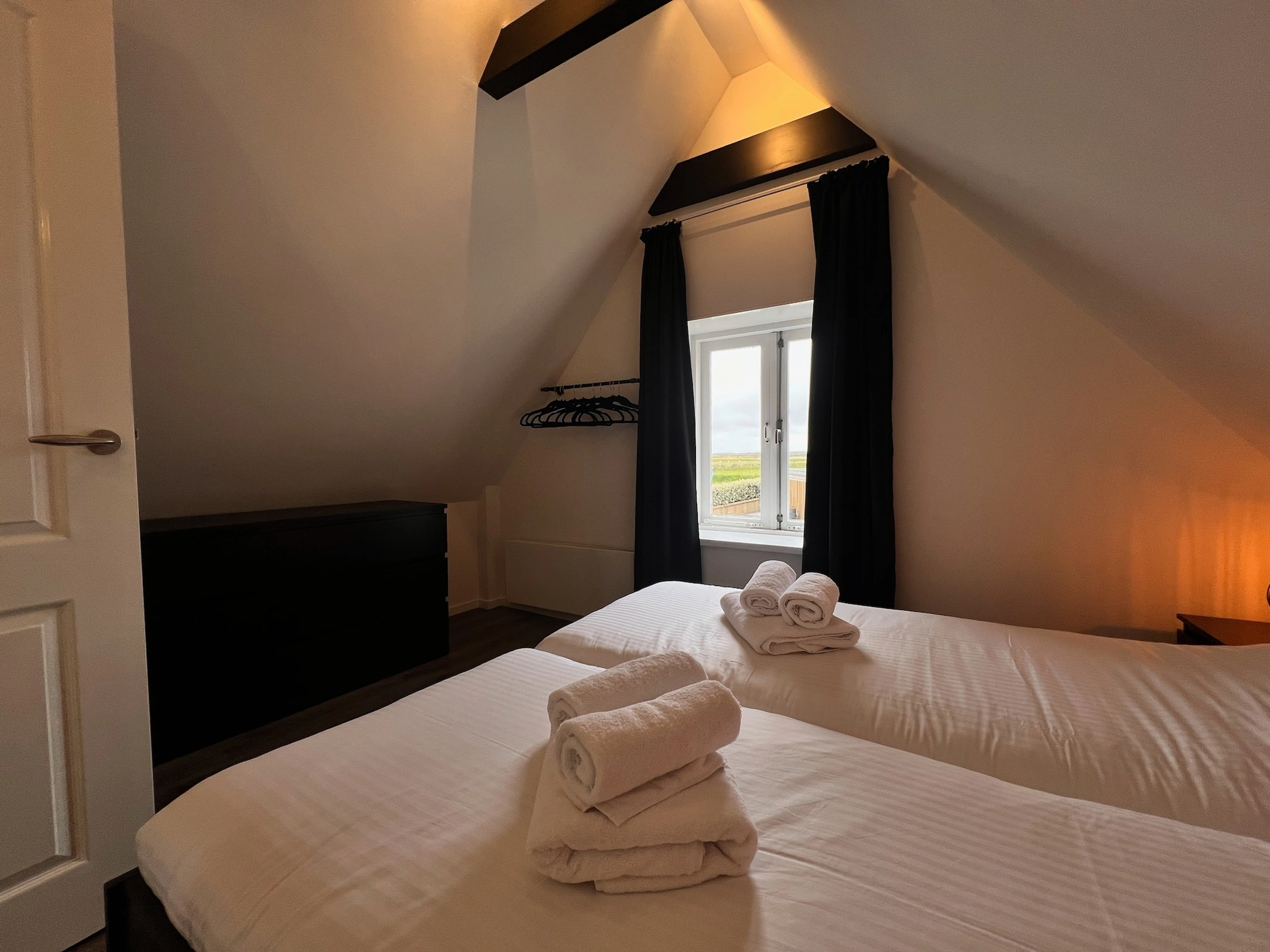 Entrance, living room with sitting area and two lounge chairs, flat-screen TV, and DVD player. Enjoy long, cozy dinners together at the generous dining table or a cozy game night. The open-plan kitchen is fully equipped with modern appliances, from a refrigerator and microwave to a dishwasher, so you can effortlessly prepare a delicious meal. A toilet is also located on the ground floor. Upstairs, you'll find two charming bedrooms: one at the rear with a double bed and a view of the forest and dunes, and one at the front with two single beds. The bathroom has a shower and sink. Outside, you can enjoy the sunny terrace at the front, complete with comfortable garden furniture. Perfect for a leisurely breakfast in the morning sun or a good glass of wine at sunset.