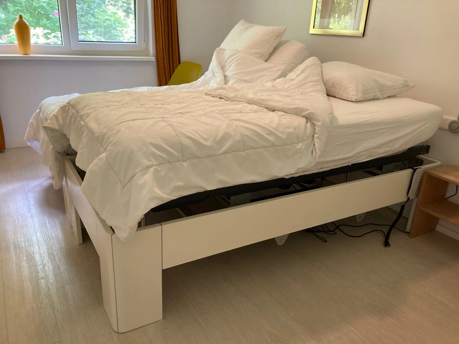 In the detached holiday home Vijverhof, the entrance with staircase leads to the spacious living room with sitting area, TV, DVD and radio/CD player with Bluetooth interface and USB connection. Open kitchen with large dining area, four-burner induction hob, oven, microwave, fridge with freezer, dishwasher, kettle, coffee maker and Senseo. Bedroom with two electrically adjustable high/low beds and with an open passage to the bathroom with barrier-free shower, height-adjustable washbasin, towel radiator and raised toilet with wall brackets. On the upper floor there is a living/sleeping room with 1 double sofa bed (160 x 200), TV, radio/CD player, fridge with freezer compartment and washing machine. Third bedroom with two single box-spring beds (90 x 200). Second bathroom with shower, bath, sink, toilet and towel radiator. Balcony on the west side so that you can enjoy the sun there from 12 noon. Holiday home Vijverhof has a spacious garden with a spacious terrace. There are two additional terraces near the natural pond. Garden furniture, outdoor kitchen and Big Green Egg barbecue are available.