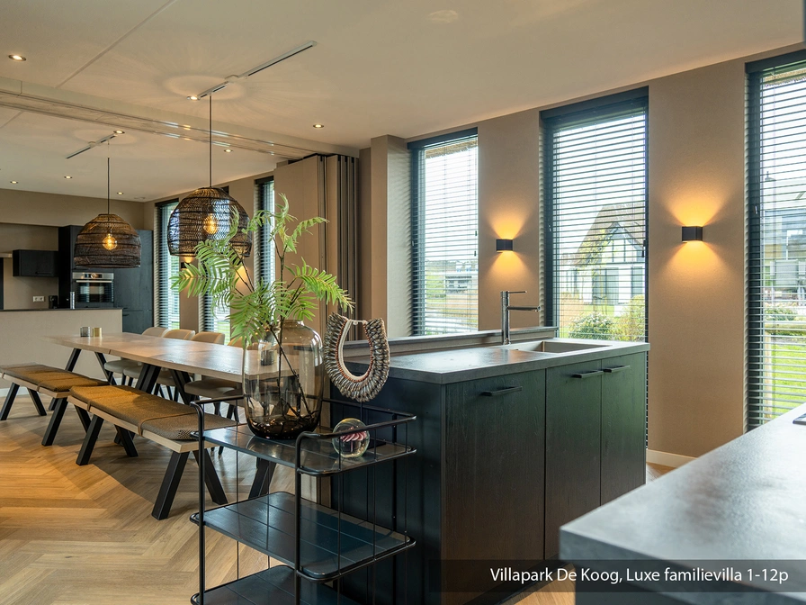 This 12-person villa consists of two semi-detached 6-person villas. Through the hall you enter the huge living room with double seating area, 2 dining areas and 2 large smart TVs. Two open kitchens, each with a 4-burner hob, dishwasher and coffee maker. Two bedrooms with 2 single beds each and a private bathroom with shower, sink and toilet. Separate third and fourth toilet. On the first floor are four bedrooms with two single beds each, two bathrooms with shower, sink and toilet. There are also two bathrooms, each with a bath, sink, toilet and two private saunas. There is a room with washing machine and dryer. From the living room you have access through the large glass sliding doors to a lovely double terrace with garden furniture and eight sun loungers.