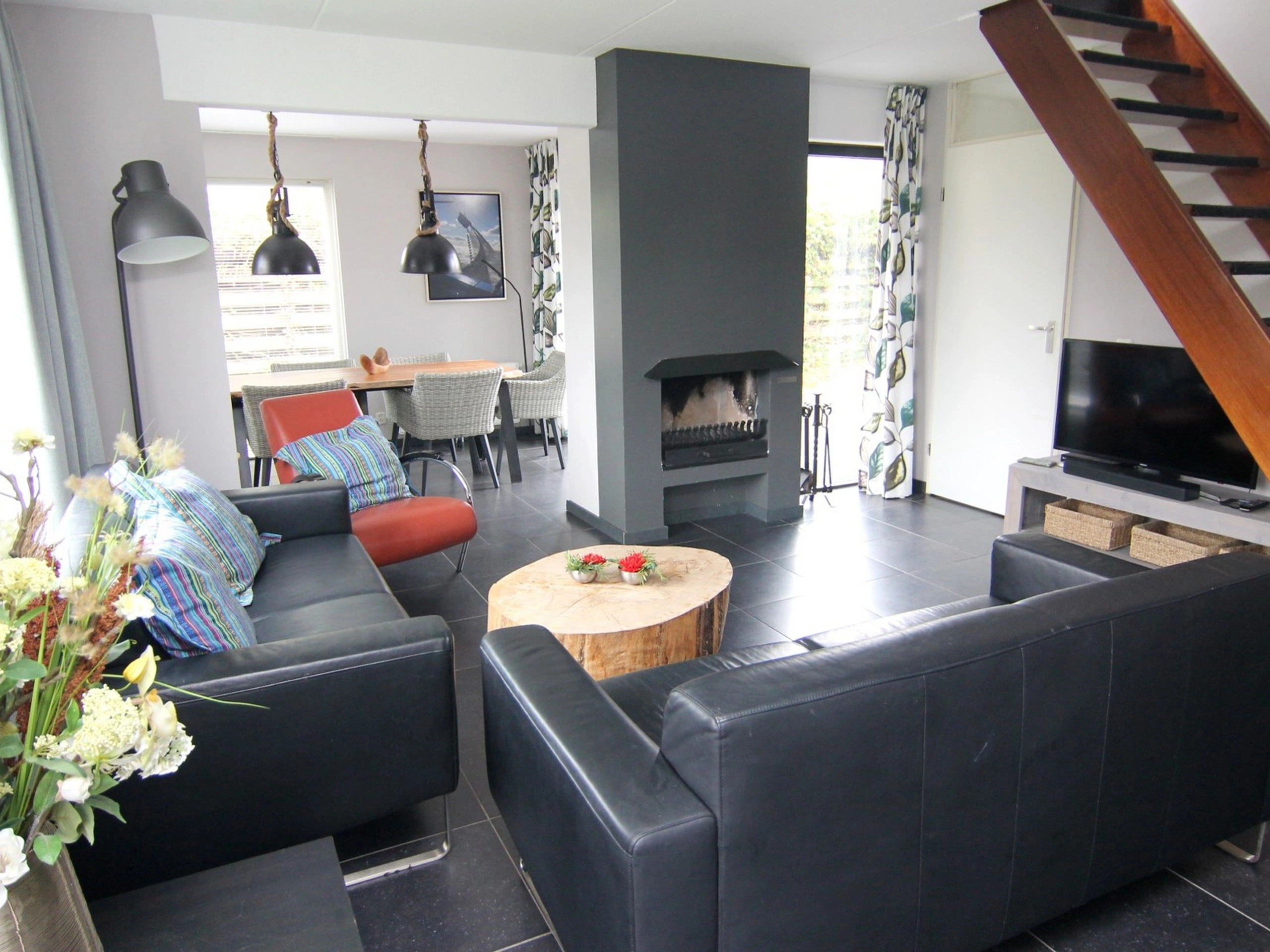 Entrance. You step into a cozy living room with a comfortable sitting area with a TV and a spacious dining area. The open-plan kitchen is fully equipped with a dishwasher, microwave, refrigerator, and coffee maker. On the ground floor, there is a bedroom with two single beds and a bathroom with a shower, sink, and toilet. Upstairs, there are two more bedrooms, both with two single beds. Outside, you can enjoy a spacious garden with a patio, complete with garden furniture for relaxing.